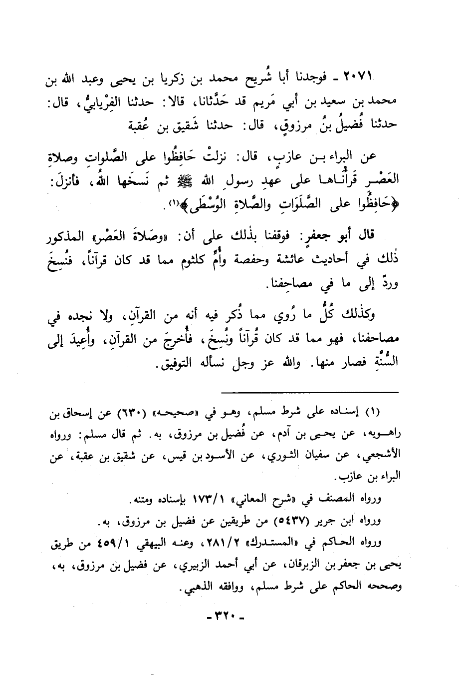 2071 - فَوَجَدْنَا أَبَا شُرَيْحٍ مُحَمَّدَ بْنَ زَكَرِيَّا بْنِ يَحْيَى وَعَبْدَ اللهِ بْنَ مُحَمَّدِ بْنِ سَعِيدِ بْنِ أَبِي مَرْيَمَ قَدْ حَدَّثَانَا قَالَا: حَدَّثَنَا الْفِرْيَابِيُّ قَالَ: حَدَّثَنَا فُضَيْلُ بْنُ مَرْزُوقٍ قَالَ: حَدَّثَنَا شَقِيقُ بْنُ عُقْبَةَ , عَنِ الْبَرَاءِ بْنِ عَازِبٍ قَالَ: " نَزَلَتْ: حَافِظُوا عَلَى الصَّلَوَاتِ وَصَلَاةِ الْعَصْرِ , قَرَأْنَاهَا عَلَى عَهْدِ رَسُولِ اللهِ صَلَّى اللَّهُ عَلَيْهِ وَسَلَّمَ , ثُمَّ نَسَخَهَا اللهُ فَأَنْزَلَ: {حَافِظُوا عَلَى الصَّلَوَاتِ وَالصَّلَاةِ الْوُسْطَى} [البقرة: 238] ". قَالَ أَبُو جَعْفَرٍ: فَوَقَفْنَا بِذَلِكَ عَلَى أَنَّ: " وَصَلَاةِ الْعَصْرِ " الْمَذْكُورَ ذَلِكَ فِي أَحَادِيثِ عَائِشَةَ وَحَفْصَةَ وَأُمِّ كُلْثُومٍ عَنْهُنَّ مِمَّا قَدْ كَانَ قُرْآنًا فَنُسِخَ , وَرُدَّ إِلَى مَا فِي مَصَاحِفِنَا , وَكَذَلِكَ كُلُّ مَا رُوِيَ مِمَّا ذُكِرَ فِيهِ أَنَّهُ مِنَ الْقُرْآنِ وَلَا نَجِدُهُ فِي مَصَاحِفِنَا , فَهُوَ مِمَّا قَدْ كَانَ قُرْآنًا وَنُسِخَ , فَأُخْرِجَ مِنَ الْقُرْآنِ وَأُعِيدَ إِلَى السُّنَّةِ فَصَارَ مِنْهَا , وَاللهَ عَزَّ وَجَلَّ نَسْأَلُهُ التَّوْفِيقَ