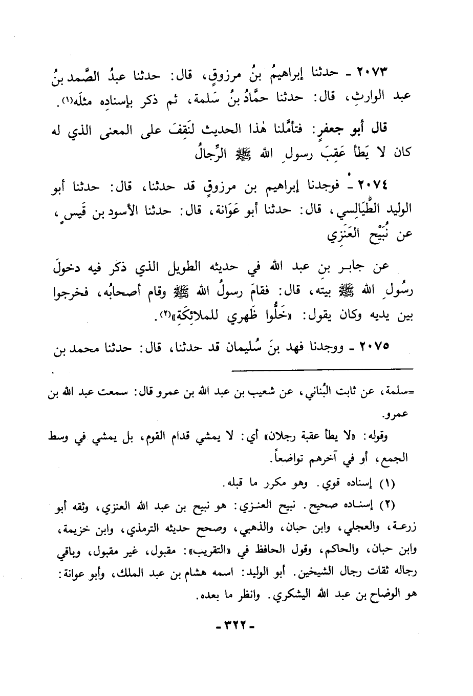 2075 - وَوَجَدْنَا فَهْدَ بْنَ سُلَيْمَانَ قَدْ حَدَّثَنَا قَالَ: حَدَّثَنَا مُحَمَّدُ بْنُ -[323]- سَعِيدِ بْنِ الْأَصْبَهَانِيِّ قَالَ: حَدَّثَنَا وَكِيعٌ , عَنْ سُفْيَانَ , عَنِ الْأَسْوَدِ بْنِ قَيْسٍ , عَنْ نُبَيْحٍ الْعَنَزِيِّ , عَنْ جَابِرِ بْنِ عَبْدِ اللهِ رَضِيَ اللهُ عَنْهُمَا قَالَ: " كَانَ رَسُولُ اللهِ صَلَّى اللَّهُ عَلَيْهِ وَسَلَّمَ إِذَا خَرَجَ مِنْ مَنْزِلِهِ مَشَى أَصْحَابُهُ أَمَامَهُ وَخَلَّوْا خَلْفَهُ لِلْمَلَائِكَةِ ". فَدَلَّ مَا فِي هَذَا عَلَى أَنَّهُ صَلَّى اللَّهُ عَلَيْهِ وَسَلَّمَ إِنَّمَا كَانَ لَا يَطَأُ عَقِبَهُ لِأَنَّهُ كَانَ خَلْفَهُ مِنَ الْمَلَائِكَةِ مَنْ كَانَ يَمْشِي خَلْفَهُ , فَكَانَتِ الْكَرَاهَةُ فِي الْحَدِيثِ الْأَوَّلِ الَّذِي رَوَيْنَاهُ عَنْ عَبْدِ اللهِ بْنِ عَمْرٍو مِنْهُ لِذَلِكَ لَا لِمَا سِوَاهُ , وَفِي ذَلِكَ مَا قَدْ دَلَّ عَلَى أَنَّ غَيْرَهُ صَلَّى اللَّهُ عَلَيْهِ وَسَلَّمَ فِي ذَلِكَ بِخِلَافِهِ , وَأَنَّهُ لَا بَأْسَ عَلَيْهِ بِوَطْءِ الرِّجَالِ عَقِبَهُ وَمَشْيِهِمْ خَلْفَهُ , وَقَدْ رُوِيَ عَنْهُ صَلَّى اللَّهُ عَلَيْهِ وَسَلَّمَ فِيمَا كَانَ مِنْهُ لِبَعْضِ مَنْ كَانَ اتَّبَعَهُ لِمَشْيِهِ خَلْفَهُ