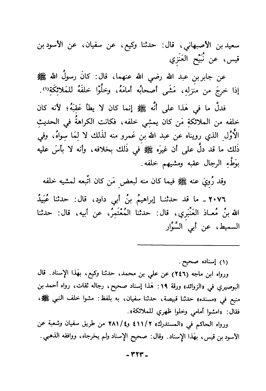 2076 - مَا قَدْ حَدَّثَنَا إِبْرَاهِيمُ بْنُ أَبِي دَاوُدَ قَالَ: حَدَّثَنَا عُبَيْدُ اللهِ بْنُ مُعَاذٍ الْعَنْبَرِيُّ قَالَ: حَدَّثَنَا الْمُعْتَمِرُ , عَنْ أَبِيهِ قَالَ: حَدَّثَنَا السُّمَيْطُ , عَنْ أَبِي السَّوَّارِ , -[324]- يُحَدِّثُهُ أَبُو السَّوَّارِ , عَنْ خَالِهِ قَالَ: " رَأَيْتُ رَسُولَ اللهِ صَلَّى اللَّهُ عَلَيْهِ وَسَلَّمَ يَمْشِي وَأُنَاسٌ يَتْبَعُونَهُ , فَاتَّبَعْتُهُ مَعَهُمْ , فَاتَّقَى الْقَوْمُ بِي , فَأَتَى عَلَيَّ رَسُولُ اللهِ صَلَّى اللَّهُ عَلَيْهِ وَسَلَّمَ فَضَرَبَنِي , إِمَّا قَالَ: بِعَسِيبٍ أَوْ قَضِيبٍ أَوْ سِوَاكٍ , أَوْ شَيْءٍ كَانَ مَعَهُ , فَوَاللهِ مَا أَعْجَبَنِي , وَبِتُّ بِلَيْلَةٍ وَقُلْتُ: مَا ضَرَبَنِي رَسُولُ اللهِ صَلَّى اللَّهُ عَلَيْهِ وَسَلَّمَ إِلَّا لِشَيْءٍ عَلِمَهُ بِي , فَحَدَّثَتْنِي نَفْسِي أَنْ آتِيَ رَسُولَ اللهِ صَلَّى اللَّهُ عَلَيْهِ وَسَلَّمَ إِذَا أَصْبَحْتُ , فَنَزَلَ جِبْرِيلُ عَلَى النَّبِيِّ صَلَّى اللَّهُ عَلَيْهِ وَسَلَّمَ فَقَالَ: إِنَّكَ رَاعٍ فَلَا تَكْسِرْ قُرُونَ رَعِيَّتِكَ , فَلَمَّا صَلَّى الْغَدَاةَ , أَوْ قَالَ أَصْبَحْنَا , قَالَ رَسُولُ اللهِ صَلَّى اللَّهُ عَلَيْهِ وَسَلَّمَ: " إِنَّ نَاسًا يَتْبَعُونِي , وَإِنَّهُ لَا يُعْجِبُنِي أَنْ يَتْبَعُونِي , اللهُمَّ مَنْ ضَرَبْتُ أَوْ سَبَبْتُ فَاجْعَلْهَا لَهُ كَفَّارَةً وَأَجْرًا , أَوْ قَالَ مَغْفِرَةً " أَوْ كَمَا قَالَ. فَفِيمَا قَدْ رَوَيْنَا فِيمَا قَبْلَ هَذَا الْحَدِيثِ مِنْ حَدِيثِ جَابِرٍ مَا قَدْ دَلَّ عَلَى الْمَعْنَى الَّذِي كَانَ رَسُولُ اللهِ صَلَّى اللَّهُ عَلَيْهِ وَسَلَّمَ يَكْرَهُ أَنْ يَتْبَعَهُ الرِّجَالُ مِنْ خَلْفِهِ , وَاللهَ نَسْأَلُهُ التَّوْفِيقَ
