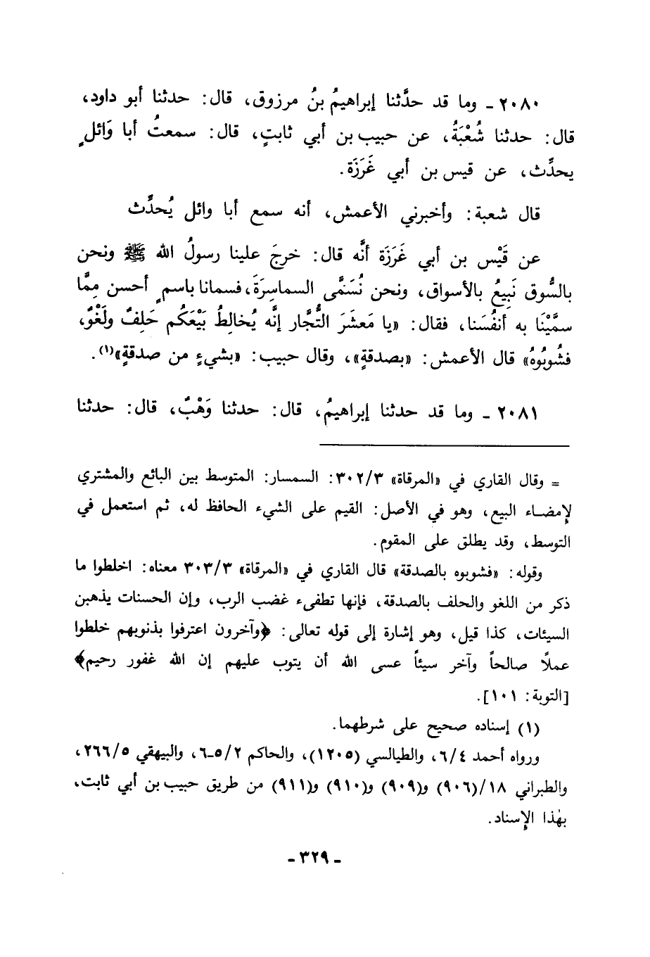 2080 - وَمَا قَدْ حَدَّثَنَا إِبْرَاهِيمُ بْنُ مَرْزُوقٍ قَالَ: حَدَّثَنَا أَبُو دَاوُدَ قَالَ: حَدَّثَنَا شُعْبَةُ , عَنْ حَبِيبِ بْنِ أَبِي ثَابِتٍ قَالَ: سَمِعْتُ أَبَا وَائِلٍ يُحَدِّثُ , عَنْ قَيْسِ بْنِ أَبِي غَرْزَةَ قَالَ شُعْبَةُ وَأَخْبَرَنِي الْأَعْمَشُ , أَنَّهُ سَمِعَ أَبَا وَائِلٍ يُحَدِّثُ , عَنْ قَيْسِ بْنِ أَبِي غَرْزَةَ , أَنَّهُ قَالَ: خَرَجَ عَلَيْنَا رَسُولُ اللهِ صَلَّى اللَّهُ عَلَيْهِ وَسَلَّمَ وَنَحْنُ بِالسُّوقِ , نَبِيعُ بِالْأَسْوَاقِ , وَنَحْنُ نُسَمَّى السَّمَاسِرَةَ , فَسَمَّانَا بِاسْمٍ أَحْسَنَ مِمَّا سَمَّيْنَا بِهِ أَنْفُسَنَا , فَقَالَ: يَا مَعْشَرَ التُّجَّارِ إِنَّهُ يُخَالِطُ بَيْعَكُمْ حَلِفٌ وَلَغْوٌ فَشُوبُوهُ. قَالَ الْأَعْمَشُ " بِصَدَقَةٍ " وَقَالَ حَبِيبٌ " بِشَيْءٍ مِنْ صَدَقَةٍ "