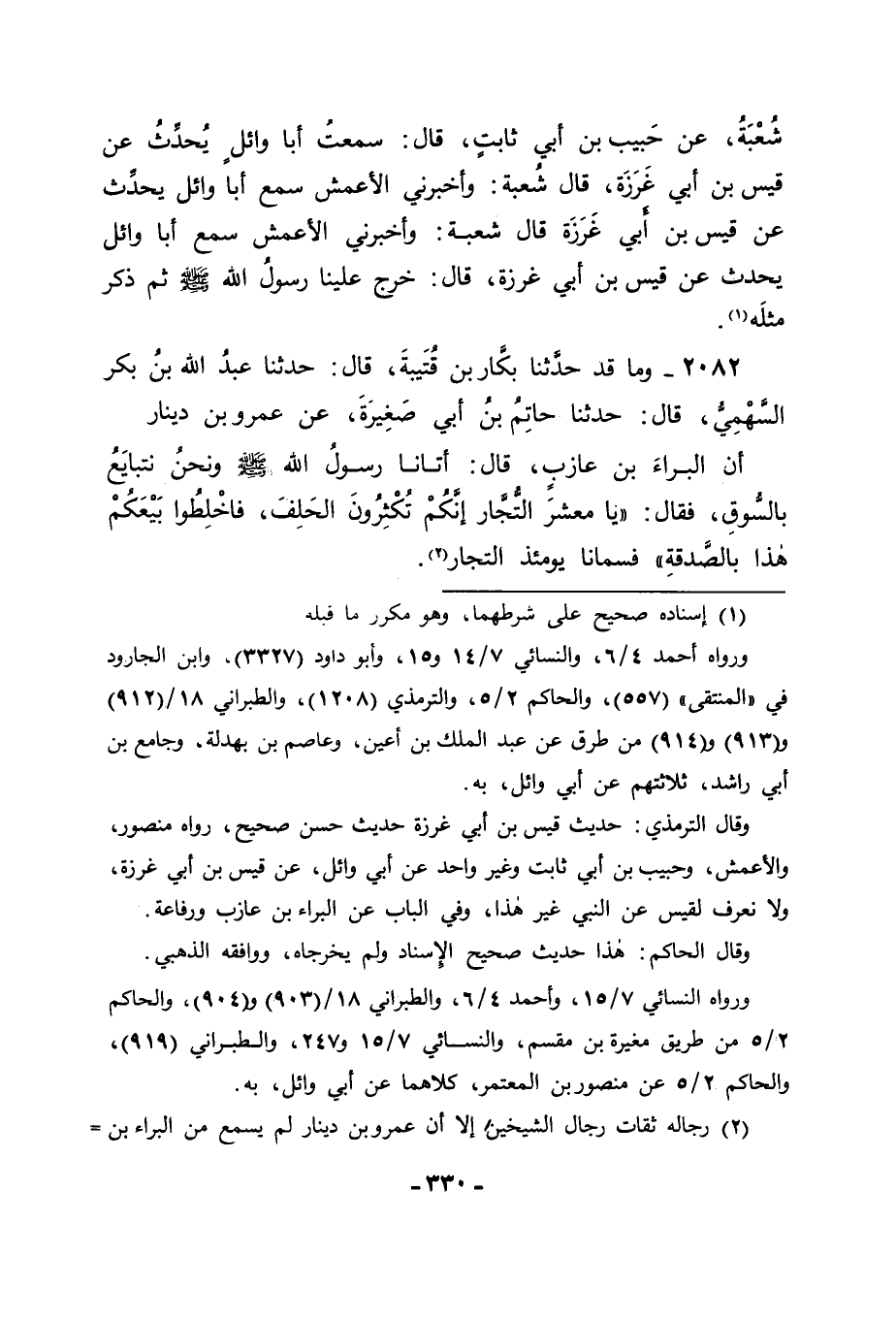 2082 - وَمَا قَدْ حَدَّثَنَا بَكَّارُ بْنُ قُتَيْبَةَ قَالَ: حَدَّثَنَا عَبْدُ اللهِ بْنُ بَكْرٍ السَّهْمِيُّ قَالَ: حَدَّثَنَا حَاتِمُ بْنُ أَبِي صَغِيرَةَ , عَنْ عَمْرِو بْنِ دِينَارٍ , أَنَّ الْبَرَاءَ بْنَ عَازِبٍ قَالَ: أَتَانَا رَسُولُ اللهِ صَلَّى اللَّهُ عَلَيْهِ وَسَلَّمَ وَنَحْنُ نَتَبَايَعُ بِالسُّوقِ فَقَالَ: " يَا مَعْشَرَ التُّجَّارِ , إِنَّكُمْ تُكْثِرُونَ الْحَلِفَ , فَاخْلِطُوا بَيْعَكُمْ هَذَا بِالصَّدَقَةِ " فَسَمَّانَا يَوْمَئِذٍ التُّجَّارَ. -[331]- قَالَ أَبُو جَعْفَرٍ: فَكَانَ ذَلِكَ أَيْضًا كَمَا قَدْ رَوَيْنَاهُ قَبْلَهُ , وَكَانَ الْكَلَامُ فِيهِ كَالْكَلَامِ فِيمَا تَكَلَّمْنَا بِهِ فِيمَا رَوَيْنَاهُ قَبْلَهُ , وَقَدْ رُوِيَ هَذَا الْحَدِيثُ عَنْ رَسُولِ اللهِ صَلَّى اللَّهُ عَلَيْهِ وَسَلَّمَ مِنْ وَجْهٍ آخَرَ بَيَّنَ فِيهِ مَنْ أَرَادَهُمْ مِنَ التُّجَّارِ , وَاسْتَثْنَى مَنْ لَمْ يُرِدْهُ مِنْهُمْ بِذَلِكَ الْقَوْلِ