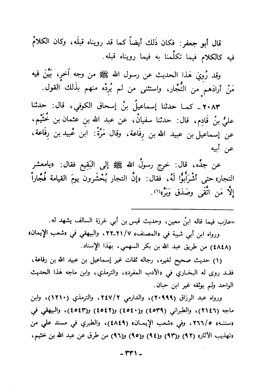 2083 - كَمَا حَدَّثَنَا إِسْمَاعِيلُ بْنُ إِسْحَاقَ الْكُوفِيُّ قَالَ: حَدَّثَنَا عَلِيُّ بْنُ قَادِمٍ قَالَ: حَدَّثَنَا سُفْيَانُ , عَنْ عَبْدِ اللهِ بْنِ عُثْمَانَ بْنِ خُثَيْمٍ , عَنْ إِسْمَاعِيلَ بْنِ عُبَيْدِ اللهِ بْنِ رِفَاعَةَ وَقَالَ مَرَّةً: ابْنِ عُبَيْدِ بْنِ رِفَاعَةَ , عَنْ أَبِيهِ , عَنْ جَدِّهِ قَالَ: خَرَجَ رَسُولُ اللهِ صَلَّى اللَّهُ عَلَيْهِ وَسَلَّمَ إِلَى الْبَقِيعِ فَقَالَ: " يَا مَعْشَرَ التُّجَّارِ " حَتَّى اشْرَأَبُّوا لَهُ , فَقَالَ: " إِنَّ التُّجَّارَ يُحْشَرُونَ يَوْمَ الْقِيَامَةِ فُجَّارًا إِلَّا مَنِ اتَّقَى , وَصَدَقَ , وَبَرَّ ". -[332]- فَبَيَّنَ لَنَا هَذَا الْحَدِيثِ التُّجَّارَ الْمَعْنِيِّينَ بِمَا فِي الْأَحَادِيثِ الْأُوَلِ , وَأَنَّهُمْ غَيْرُ التُّجَّارِ الَّذِينَ يَسْتَعْمِلُونَ فِي تِجَارَاتِهِمُ الصِّدْقَ وَالتُّقَى وَالْبِرَّ. وَبِاللهِ التَّوْفِيقُ. وَقَدْ رُوِيَ عَنْ عَلِيِّ بْنِ أَبِي طَالِبٍ رَضِيَ اللهُ عَنْهُ عَنِ النَّبِيِّ صَلَّى اللَّهُ عَلَيْهِ وَسَلَّمَ فِي هَذَا الْمَعْنَى