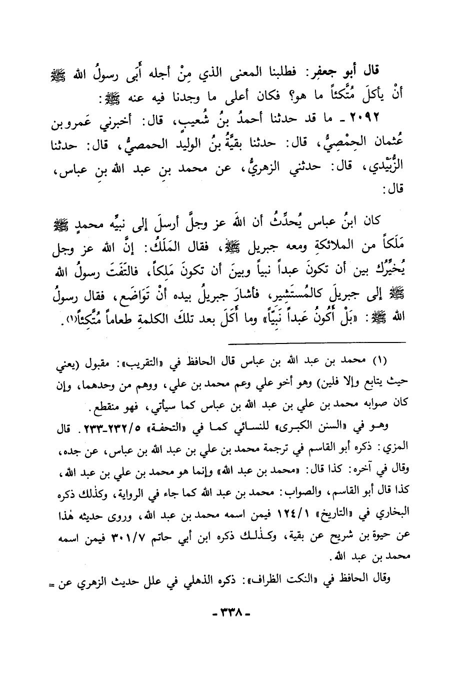 2092 - مَا قَدْ حَدَّثَنَا أَحْمَدُ بْنُ شُعَيْبٍ قَالَ: أَخْبَرَنِي عَمْرُو بْنُ عُثْمَانَ الْحِمْصِيُّ قَالَ: حَدَّثَنَا بَقِيَّةُ بْنُ الْوَلِيدِ الْحِمْصِيُّ قَالَ: حَدَّثَنَا الزُّبَيْدِيُّ قَالَ: حَدَّثَنِي الزُّهْرِيُّ , عَنْ مُحَمَّدِ بْنِ عَبْدِ اللهِ بْنِ عَبَّاسٍ قَالَ: كَانَ ابْنُ عَبَّاسٍ يُحَدِّثُ: أَنَّ اللهَ عَزَّ وَجَلَّ أَرْسَلَ إِلَى نَبِيِّهِ مُحَمَّدٍ صَلَّى اللَّهُ عَلَيْهِ وَسَلَّمَ مَلَكًا مِنَ الْمَلَائِكَةِ وَمَعَهُ جِبْرِِيلُ صَلَّى اللَّهُ عَلَيْهِ وَسَلَّمَ , فَقَالَ الْمَلَكُ: إِنَّ اللهَ عَزَّ وَجَلَّ يُخَيِّرُكَ بَيْنَ أَنْ تَكُونَ عَبْدًا نَبِيًّا , وَبَيْنَ أَنْ تَكُونَ مَلِكًا , فَالْتَفَتَ رَسُولُ اللهِ صَلَّى اللَّهُ عَلَيْهِ وَسَلَّمَ إِلَى جِبْرِيلَ كَالْمُسْتَشِيرِ , فَأَشَارَ جَبْرَائِيلُ عَلَيْهِ السَّلَامُ بِيَدِهِ أَنْ تَوَاضَعْ , فَقَالَ رَسُولُ اللهِ صَلَّى اللَّهُ عَلَيْهِ وَسَلَّمَ: " بَلْ أَكُونُ عَبْدًا نَبِيًّا " وَمَا أَكَلَ بَعْدَ تِلْكَ الْكَلِمَةِ طَعَامًا مُتَّكِئًا. -[339]- قَالَ لَنَا أَحْمَدُ بْنُ شُعَيْبٍ: وَلَا نَعْلَمُ مُحَمَّدَ بْنَ عَبْدِ اللهِ بْنِ عَبَّاسٍ هَذَا إِلَّا مُحَمَّدَ بْنَ عَلِيِّ بْنِ عَبْدِ اللهِ بْنِ عَبَّاسٍ , كَأَنَّ الزُّهْرِيَّ نَسَبَهُ إِلَى جَدِّهِ وَلَا نَعْلَمُ لَهُ سَمَاعًا مِنْ جَدِّهِ. قَالَ أَبُو جَعْفَرٍ: فَهَذَا أَعْلَى مَا وَجَدْنَاهُ عَنْ رَسُولِ اللهِ صَلَّى اللَّهُ عَلَيْهِ وَسَلَّمَ فِي الْمَعْنَى الَّذِي مِنْ أَجْلِهِ لَمْ يَكُنْ يَأْكُلُ مُتَّكِئًا , وَهَذَا مَعْنًى حَسَنٌ , وَقَدْ يَحْتَمِلُ أَنْ يَكُونَ تَرَكَ الْأَكْلَ مُتَّكِئًا؛ لِأَنَّ الْأَكْلَ مُتَّكِئًا لَيْسَ مِمَّا جَرَتْ عَلَيْهِ عَادَةُ الْعَرَبِ , وَإِنَّمَا جَرَتْ عَادَتُهُمْ عَلَى ضِدِّهِ , وَمِثْلُ ذَلِكَ مَا قَدْ رُوِيَ عَنْ عُمَرَ بْنِ الْخَطَّابِ رَضِيَ اللهُ عَنْهُ , حَدَّثَنَا حُسَيْنُ بْنُ نَصْرٍ قَالَ: سَمِعْتُ يَزِيدَ بْنِ هَارُونَ قَالَ: أَخْبَرَنَا عَاصِمٌ الْأَحْوَلُ , عَنْ أَبِي عُثْمَانَ قَالَ: أَتَانَا كِتَابُ عُمَرَ رَضِيَ اللهُ عَنْهُ: " اخْشَوْشِنُوا , وَاخْشَوْشِبُوا وَاخْلَوْلِقُوا وَتَمَعْدَدُوا , كَأَنَّكُمْ مُعَدٌّ , وَإِيَّايَ وَالتَّنَعُّمَ وَزِيَّ الْعَجَمِ " -[340]- قَالَ: فَنَهَاهُمْ عَنْ زِيِّ الْعَجَمِ وَمِنْهُ التَّنَعُّمُ , وَأَمَرَهُمْ بِالتَّمَعْدُدِ وَهُوَ الْعَيْشُ الْخَشِنُ الَّذِي تَعْرِفُهُ الْعَرَبُ فَمِثْلُ ذَلِكَ عِنْدَنَا , وَاللهُ أَعْلَمُ , تَرْكُ -[341]- رَسُولِ اللهِ صَلَّى اللَّهُ عَلَيْهِ وَسَلَّمَ الْأَكْلَ مُتَّكِئًا , قَدْ يَحْتَمِلُ أَنْ يَكُونَ لِأَنَّهُ مِنْ قَوْمٍ لَمْ تَجْرِ عَادَتُهُمْ عَلَيْهِ , وَوَكَّدَهُ مِنْ عَادَتِهِمْ عِنْدَهُ مَا أَمَرَهُ بِهِ عَزَّ وَجَلَّ مِنَ الْأَشْيَاءِ الَّتِي يَكُونُ بِهَا عَلَى مَا كَانَ الْأَنْبِيَاءُ قَبْلَهُ عَلَيْهِ , صَلَوَاتُ اللهِ عَلَيْهِمْ , بِخِلَافِ مَا كَانَ الْعَجَمُ عَلَيْهِ , وَاللهَ عَزَّ وَجَلَّ نَسْأَلُهُ التَّوْفِيقَ