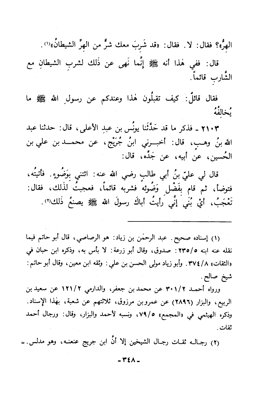2103 - فَذَكَرَ مَا قَدْ حَدَّثَنَا يُونُسُ بْنُ عَبْدِ الْأَعْلَى قَالَ: حَدَّثَنَا عَبْدُ اللهِ بْنُ وَهْبٍ قَالَ: أَخْبَرَنِي ابْنُ جُرَيْجٍ , عَنْ مُحَمَّدِ بْنِ عَلِيِّ بْنِ الْحُسَيْنِ , عَنْ أَبِيهِ , عَنْ جَدِّهِ قَالَ: قَالَ لِي عَلِيُّ بْنُ أَبِي طَالِبٍ رَضِيَ اللهُ عَنْهُ: ائْتِنِي بِوَضُوءٍ. فَأَتَيْتُهُ فَتَوَضَّأَ , ثُمَّ قَامَ بِفَضْلِ وَضُوئِهِ فَشَرِبَهُ قَائِمًا , فَعَجِبْتُ لِذَلِكَ , فَقَالَ: أَتَعْجَبُ , أَيْ بُنَيَّ: إِنِّي رَأَيْتُ أَبَاكَ رَسُولَ اللهِ صَلَّى اللَّهُ عَلَيْهِ وَسَلَّمَ يَصْنَعُ ذَلِكَ