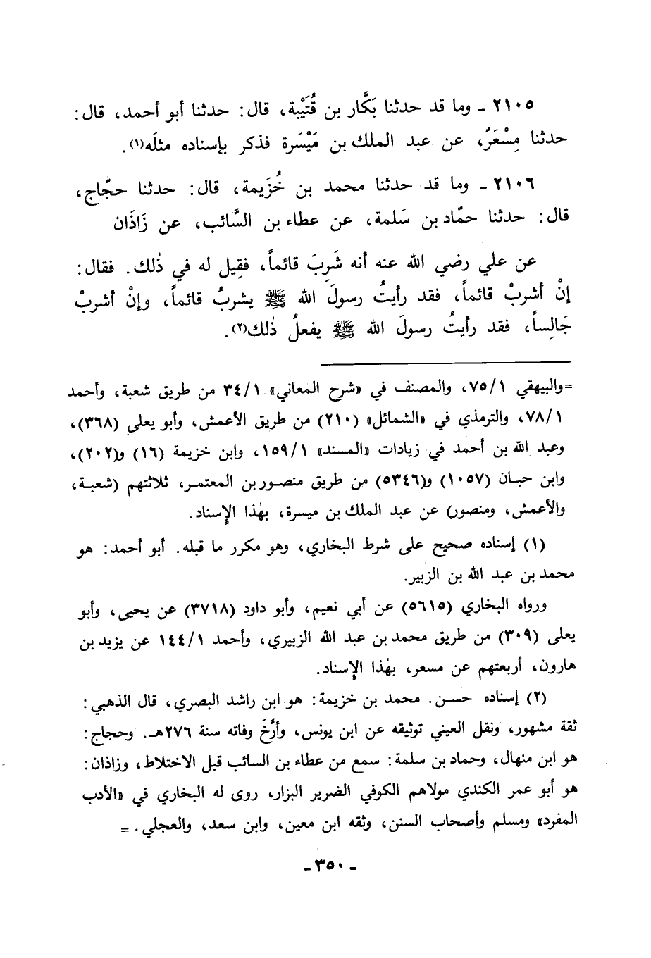2106 - وَمَا قَدْ حَدَّثَنَا مُحَمَّدُ بْنُ خُزَيْمَةَ قَالَ: حَدَّثَنَا حَجَّاجٌ قَالَ: حَدَّثَنَا حَمَّادُ بْنُ سَلَمَةَ , عَنْ عَطَاءِ بْنِ السَّائِبِ , عَنْ زَاذَانَ , عَنْ عَلِيٍّ رَضِيَ اللهُ عَنْهُ , أَنَّهُ شَرِبَ قَائِمًا فَقِيلَ لَهُ فِي ذَلِكَ , فَقَالَ: إِنْ أَشْرَبْ قَائِمًا فَقَدْ رَأَيْتُ رَسُولَ اللهِ صَلَّى اللَّهُ عَلَيْهِ وَسَلَّمَ يَشْرَبُ قَائِمًا , وَإِنْ أَشْرَبْ جَالِسًا فَقَدْ رَأَيْتُ رَسُولَ اللهِ صَلَّى اللَّهُ عَلَيْهِ وَسَلَّمَ يَفْعَلُ ذَلِكَ. -[351]-