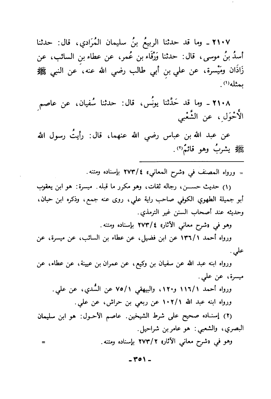 2108 - وَمَا قَدْ حَدَّثَنَا يُونُسُ قَالَ: حَدَّثَنَا سُفْيَانُ , عَنْ عَاصِمٍ الْأَحْوَلِ , عَنِ الشَّعْبِيِّ , عَنْ عَبْدِ اللهِ بْنِ عَبَّاسٍ رَضِيَ اللهُ عَنْهُمَا قَالَ: رَأَيْتُ رَسُولَ اللهِ صَلَّى اللَّهُ عَلَيْهِ وَسَلَّمَ يَشْرَبُ وَهُوَ قَائِمٌ