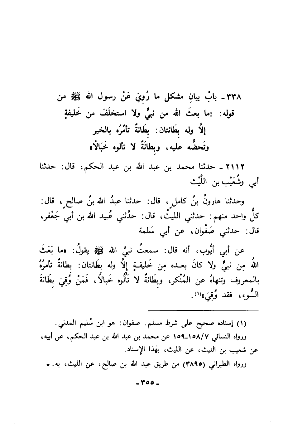 2112 - حَدَّثَنَا مُحَمَّدُ بْنُ عَبْدِ اللهِ بْنِ عَبْدِ الْحَكَمِ قَالَ: حَدَّثَنَا أَبِي، وَشُعَيْبُ بْنُ اللَّيْثِ , وَحَدَّثَنَا هَارُونُ بْنُ كَامِلٍ قَالَ: حَدَّثَنَا عَبْدُ اللهِ بْنُ صَالِحٍ قَالَ كُلُّ وَاحِدٍ مِنْهُمْ: حَدَّثَنِي اللَّيْثُ قَالَ: حَدَّثَنِي عُبَيْدُ اللهِ بْنُ أَبِي جَعْفَرٍ قَالَ: حَدَّثَنِي صَفْوَانُ , عَنْ أَبِي سَلَمَةَ , عَنْ أَبِي أَيُّوبَ أَنَّهُ قَالَ: سَمِعْتُ نَبِيَّ اللهِ صَلَّى اللَّهُ عَلَيْهِ وَسَلَّمَ يَقُولُ: " مَا بَعَثَ اللهُ مِنْ نَبِيٍّ وَلَا كَانَ بَعْدَهُ مِنْ خَلِيفَةٍ إِلَّا وَلَهُ بِطَانَتَانِ: بِطَانَةٌ تَأْمُرُهُ بِالْمَعْرُوفِ , وَتَنْهَاهُ عَنِ الْمُنْكَرِ , وَبِطَانَةٌ لَا تَأْلُوهُ خَبَالًا , فَمَنْ وُقِيَ بِطَانَةَ السُّوءِ فَقَدْ وُقِيَ "