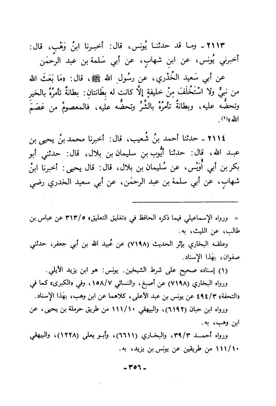 2113 - وَمَا قَدْ حَدَّثَنَا يُونُسُ قَالَ: أَخْبَرَنَا ابْنُ وَهْبٍ قَالَ: أَخْبَرَنِي يُونُسُ , عَنِ ابْنِ شِهَابٍ , عَنْ أَبِي سَلَمَةَ بْنِ عَبْدِ الرَّحْمَنِ , عَنْ أَبِي سَعِيدٍ الْخُدْرِيِّ , عَنْ رَسُولِ اللهِ صَلَّى اللَّهُ عَلَيْهِ وَسَلَّمَ قَالَ: " مَا بَعَثَ اللهُ مِنْ نَبِيٍّ , وَلَا اسْتَخْلَفَ مِنْ خَلِيفَةٍ إِلَّا كَانَتْ لَهُ بِطَانَتَانِ: بِطَانَةٌ تَأْمُرُهُ بِالْخَيْرِ , وَتَحُضُّهُ عَلَيْهِ , وَبِطَانَةٌ تَأْمُرُهُ بِالشَّرِّ , وَتَحُضُّهُ عَلَيْهِ , فَالْمَعْصُومُ مَنْ عَصَمَ اللهُ ".