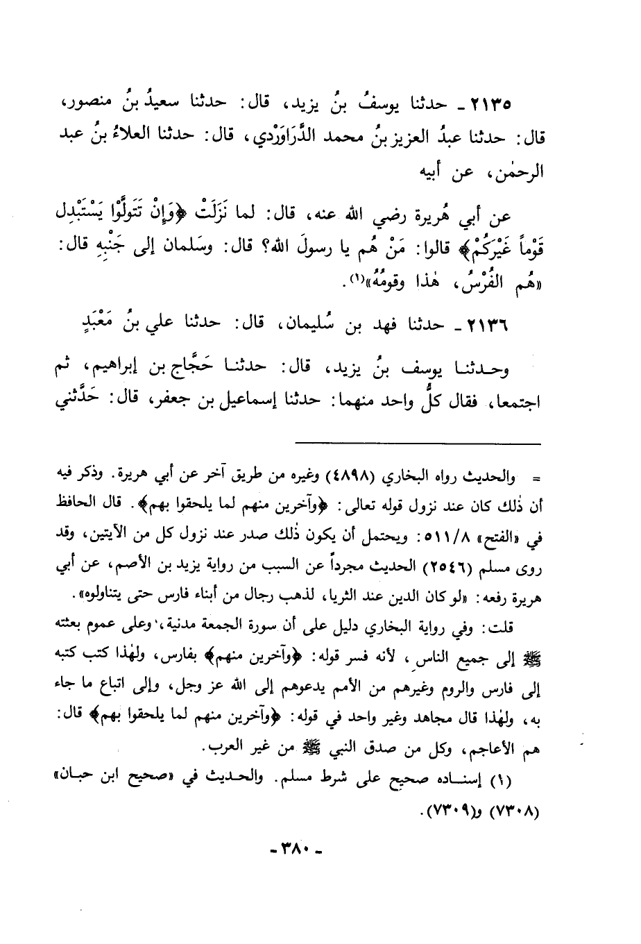 2135 - حَدَّثَنَا يُوسُفُ بْنُ يَزِيدَ قَالَ: حَدَّثَنَا سَعِيدُ بْنُ مَنْصُورٍ قَالَ: حَدَّثَنَا عَبْدُ الْعَزِيزِ بْنُ مُحَمَّدٍ الدَّرَاوَرْدِيُّ قَالَ: حَدَّثَنَا الْعَلَاءُ بْنُ عَبْدِ الرَّحْمَنِ , عَنْ أَبِيهِ , عَنْ أَبِي هُرَيْرَةَ رَضِيَ اللهُ عَنْهُ قَالَ: لَمَّا نَزَلَتْ: {وَإِنْ تَتَوَلَّوْا يَسْتَبْدِلْ قَوْمًا غَيْرَكُمْ} [محمد: 38] قَالُوا: مَنْ هُمْ يَا رَسُولَ اللهِ؟ قَالَ: وَسَلْمَانُ إِلَى جَنْبِهِ , قَالَ: " هُمُ الْفُرْسُ هَذَا وَقَوْمُهُ "