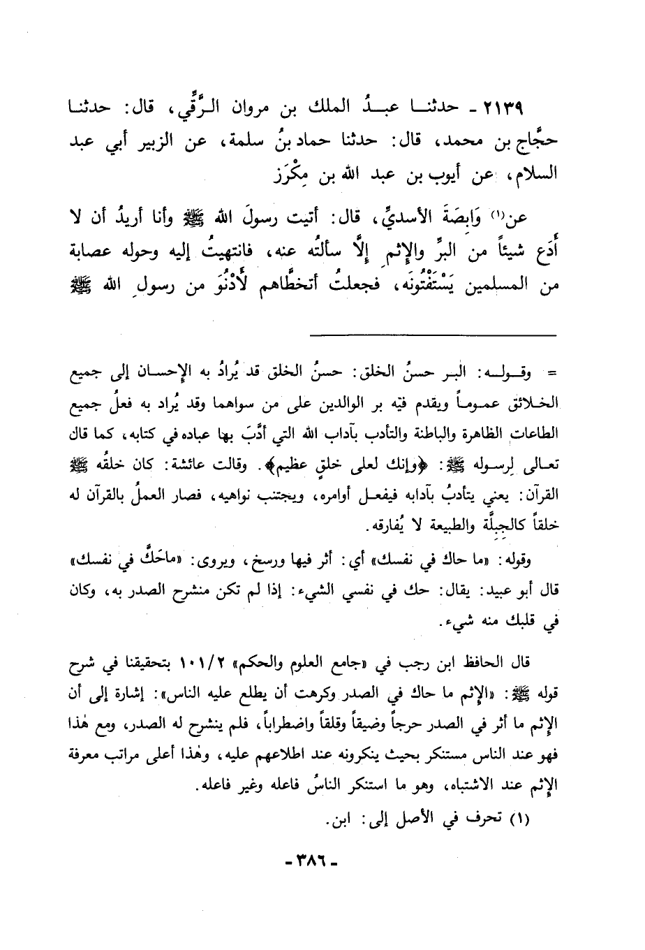 2139 - حَدَّثَنَا عَبْدُ الْمَلِكِ بْنُ مَرْوَانَ الرَّقِّيُّ قَالَ: حَدَّثَنَا حَجَّاجُ بْنُ مُحَمَّدٍ قَالَ: حَدَّثَنَا حَمَّادُ بْنُ سَلَمَةَ , عَنِ الزُّبَيْرِ أَبِي عَبْدِ السَّلَامِ , عَنْ أَيُّوبَ بْنِ عَبْدِ اللهِ بْنِ مِكْرَزٍ , عَنْ وَابِصَةَ الْأَسَدِيِّ قَالَ: أَتَيْتُ رَسُولَ اللهِ صَلَّى اللَّهُ عَلَيْهِ وَسَلَّمَ وَأَنَا أُرِيدُ أَنْ لَا أَدَعَ شَيْئًا مِنَ الْبِرِّ وَالْإِثْمِ إِلَّا سَأَلْتُهُ عَنْهُ , فَانْتَهَيْتُ إِلَيْهِ وَحَوْلَهُ عِصَابَةٌ مِنَ الْمُسْلِمِينَ يَسْتَفْتُونَهُ , فَجَعَلْتُ أَتَخَطَّاهُمْ لِأَدْنُوَ مِنْ رَسُولِ اللهِ صَلَّى اللَّهُ عَلَيْهِ وَسَلَّمَ , -[387]- فَانْتَهَرَنِي بَعْضُهُمْ وَقَالَ: إِلَيْكَ يَا وَابِصَةُ عَنْ رَسُولِ اللهِ صَلَّى اللَّهُ عَلَيْهِ وَسَلَّمَ , فَقُلْتُ: دَعُونِي , فَوَاللهِ إِنَّ أَحَبَّ النَّاسِ إِلَيَّ أَنْ أَدْنُوَ مِنْهُ لَرَسُولُ اللهِ صَلَّى اللَّهُ عَلَيْهِ وَسَلَّمَ , فَقَالَ: " دَعُوا وَابِصَةَ " ثُمَّ قَالَ: " ادْعُوا وَابِصَةَ " ثُمَّ قَالَ: " أَدْنُوا وَابِصَةَ " فَأَدْنَانِي حَتَّى قَعَدْتُ بَيْنَ يَدَيْهِ , فَقَالَ: " سَلْ أَوْ أُخْبِرُكَ؟ " فَقُلْتُ: لَا , بَلْ أَخْبِرْنِي , قَالَ: " جِئْتَ تَسْأَلُ عَنِ الْبِرِّ وَالْإِثْمِ " قُلْتُ: نَعَمْ يَا رَسُولَ اللهِ , فَجَعَلَ يَنْكُتُ بِهِنَّ فِي صَدْرِي وَيَقُولُ: " يَا وَابِصَةُ اسْتَفْتِ نَفْسَكَ " قَالَهَا ثَلَاثًا " الْبِرُّ مَا اطْمَأَنَّتْ إِلَيْهِ النَّفْسُ , وَاطْمَأَنَّ إِلَيْهِ الْقَلْبُ , وَالْإِثْمُ مَا حَاكَ فِي نَفْسِكَ وَتَرَدَّدَ فِي الصَّدْرِ , وَإِنْ أَفْتَاكَ النَّاسُ وَأَفْتَوْكَ ". قَالَ أَبُو جَعْفَرٍ: فَتَأَمَّلْنَا هَذَيْنِ الْحَدِيثَيْنِ فَوَجَدْنَا فِي حَدِيثِ النَّوَّاسِ مِنْهُمَا أَنَّ الْبِرَّ حُسْنُ الْخُلُقِ , وَفِي حَدِيثِ وَابِصَةَ مِنْهُمَا أَنَّ الْبِرَّ مَا اطْمَأَنَّتْ إِلَيْهِ النَّفْسُ , وَوَجَدْنَاهُمَا جَمِيعًا يَرْجِعَانِ إِلَى مَعْنًى وَاحِدٍ ; لِأَنَّ النَّفْسَ إِذَا اطْمَأَنَّتْ كَانَ مِنْهَا حُسْنُ الْخُلُقِ , وَكَانَ الْإِثْمُ مَعَهُ ضِدَّ ذَلِكَ مِنَ انْتِفَاءِ الطُّمَأْنِينَةِ عَنِ النَّفْسِ , وَكَانَ مَعَ ذَلِكَ سُوءُ الْخُلُقِ وَمَا يَتَرَدَّدُ فِي الصُّدُورِ عِنْدَ مِثْلِهِ , وَلَا يُخْرِجُهُ فُتْيَا النَّاسِ صَاحِبَهُ. -[388]- وَمِثْلُ ذَلِكَ مَا قَدْ رَوَاهُ الْحَسَنُ بْنُ عَلِيٍّ , عَنْ رَسُولِ اللهِ صَلَّى اللَّهُ عَلَيْهِ وَسَلَّمَ
