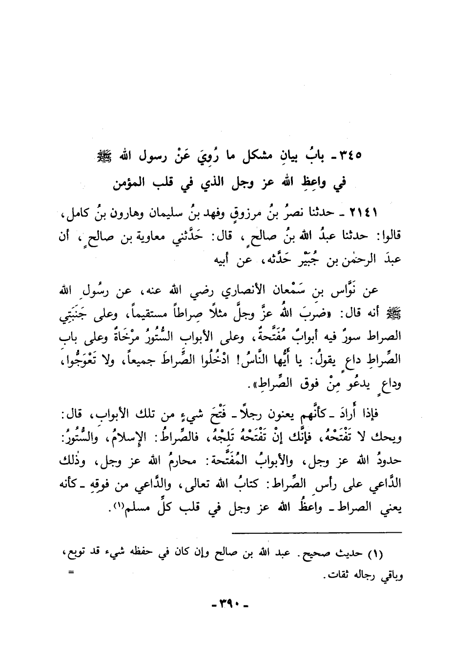 2141 - حَدَّثَنَا نَصْرُ بْنُ مَرْزُوقٍ , وَفَهْدُ بْنُ سُلَيْمَانَ , وَهَارُونُ بْنُ كَامِلٍ , قَالُوا: حَدَّثَنَا عَبْدُ اللهِ بْنُ صَالِحٍ قَالَ: حَدَّثَنِي مُعَاوِيَةُ بْنُ صَالِحٍ , أَنَّ عَبْدَ الرَّحْمَنِ بْنَ جُبَيْرٍ حَدَّثَهُ , عَنْ أَبِيهِ , عَنْ نَوَّاسِ بْنِ سَمْعَانَ الْأَنْصَارِيِّ رَضِيَ اللهُ عَنْهُ , عَنْ رَسُولِ اللهِ صَلَّى اللَّهُ عَلَيْهِ وَسَلَّمَ أَنَّهُ قَالَ: " ضَرَبَ اللهُ عَزَّ وَجَلَّ مَثَلًا صِرَاطًا مُسْتَقِيمًا , وَعَلَى جَنَبَتَيِ الصِّرَاطِ سُورٌ فِيهِ أَبْوَابٌ مُفَتَّحَةٌ , وَعَلَى الْأَبْوَابِ السُّتُورُ مُرْخَاةٌ , وَعَلَى بَابِ الصِّرَاطِ دَاعٍ يَقُولُ: يَا أَيُّهَا النَّاسُ , ادْخُلُوا الصِّرَاطَ جَمِيعًا وَلَا تَعْوَجُّوا , وَدَاعٍ يَدْعُو مِنْ فَوْقِ الصِّرَاطِ ". فَإِذَا أَرَادَ - كَأَنَّهُمْ يَعْنُونَ رَجُلًا - فَتْحَ شَيْءٍ مِنْ تِلْكَ الْأَبْوَابِ , قَالَ: وَيْحَكَ لَا تَفْتَحْهُ , فَإِنَّكَ إِنْ تَفْتَحْهُ تَلِجْهُ فَالصِّرَاطُ: الْإِسْلَامُ , وَالسُّتُورُ: حُدُودُ اللهِ عَزَّ وَجَلَّ , وَالْأَبْوَابُ الْمُفَتَّحَةُ: مَحَارِمُ اللهِ عَزَّ وَجَلَّ , وَذَلِكَ الدَّاعِي عَلَى رَأْسِ الصِّرَاطِ: كِتَابُ اللهِ تَعَالَى , وَالدَّاعِي مِنْ فَوْقِهِ كَأَنَّهُ يَعْنِي الصِّرَاطَ: وَاعِظُ اللهِ عَزَّ وَجَلَّ فِي قَلْبِ كُلِّ مُسْلِمٍ. -[391]-