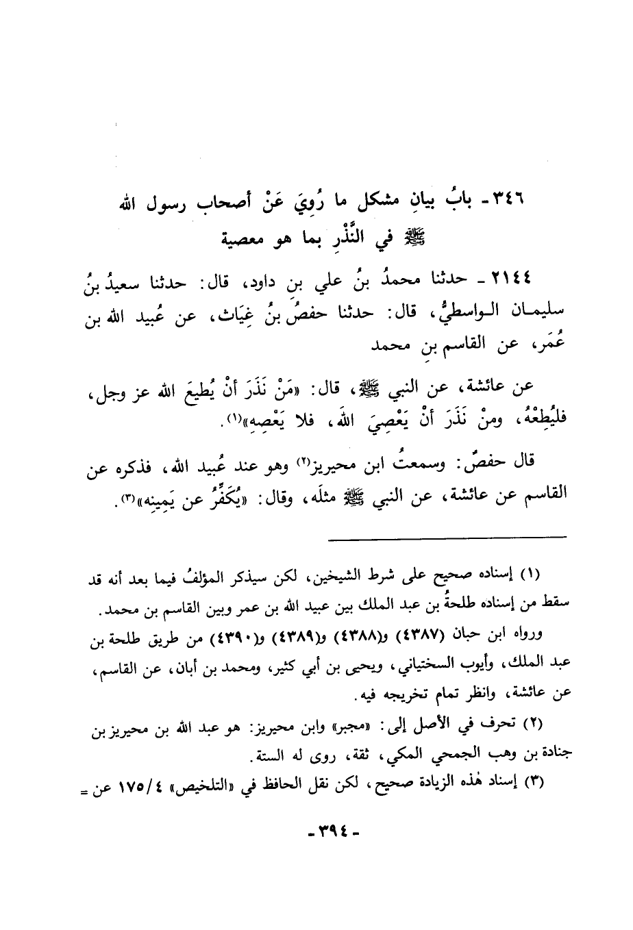 2144 - حَدَّثَنَا مُحَمَّدُ بْنُ عَلِيِّ بْنِ دَاوُدَ قَالَ: حَدَّثَنَا سَعِيدُ بْنُ سُلَيْمَانَ الْوَاسِطِيُّ قَالَ: حَدَّثَنَا حَفْصُ بْنُ غِيَاثٍ , عَنْ عُبَيْدِ اللهِ بْنِ عُمَرَ , عَنِ الْقَاسِمِ بْنِ مُحَمَّدٍ , عَنْ عَائِشَةَ , عَنِ النَّبِيِّ صَلَّى اللَّهُ عَلَيْهِ وَسَلَّمَ قَالَ: " مَنْ نَذَرَ أَنْ يُطِيعَ اللهَ عَزَّ وَجَلَّ فَلْيُطِعْهُ , وَمَنْ نَذَرَ أَنْ يَعْصِيَ اللهَ فَلَا يَعْصِهِ ". قَالَ حَفْصٌ: وَسَمِعْتُ ابْنَ مُحَيْرِيزٍ وَهُوَ عِنْدَ عُبَيْدِ اللهِ فَذَكَرَهُ , عَنِ الْقَاسِمِ , عَنْ عَائِشَةَ , عَنِ النَّبِيِّ صَلَّى اللَّهُ عَلَيْهِ وَسَلَّمَ مِثْلَهُ. وَقَالَ: " يُكَفِّرُ عَنْ يَمِينِهِ ". -[395]- قَالَ أَبُو جَعْفَرٍ: فَتَأَمَّلْنَا إِسْنَادَ هَذَا الْحَدِيثِ , فَوَجَدْنَا حَفْصَ بْنَ غِيَاثٍ حَدَّثَ بِهِ , عَنْ عُبَيْدِ اللهِ بْنِ عُمَرَ , عَنِ الْقَاسِمِ بْنِ مُحَمَّدٍ , وَكَانَ ظَاهِرُهُ سَمَاعَ عُبَيْدِ اللهِ إِيَّاهُ مِنَ الْقَاسِمِ , فَكَشَفْنَا ذَلِكَ فَوَجَدْنَاهُ لَمْ يَسْمَعْهُ مِنْهُ وَإِنَّمَا أَخَذَهُ مِنْ غَيْرِهِ
