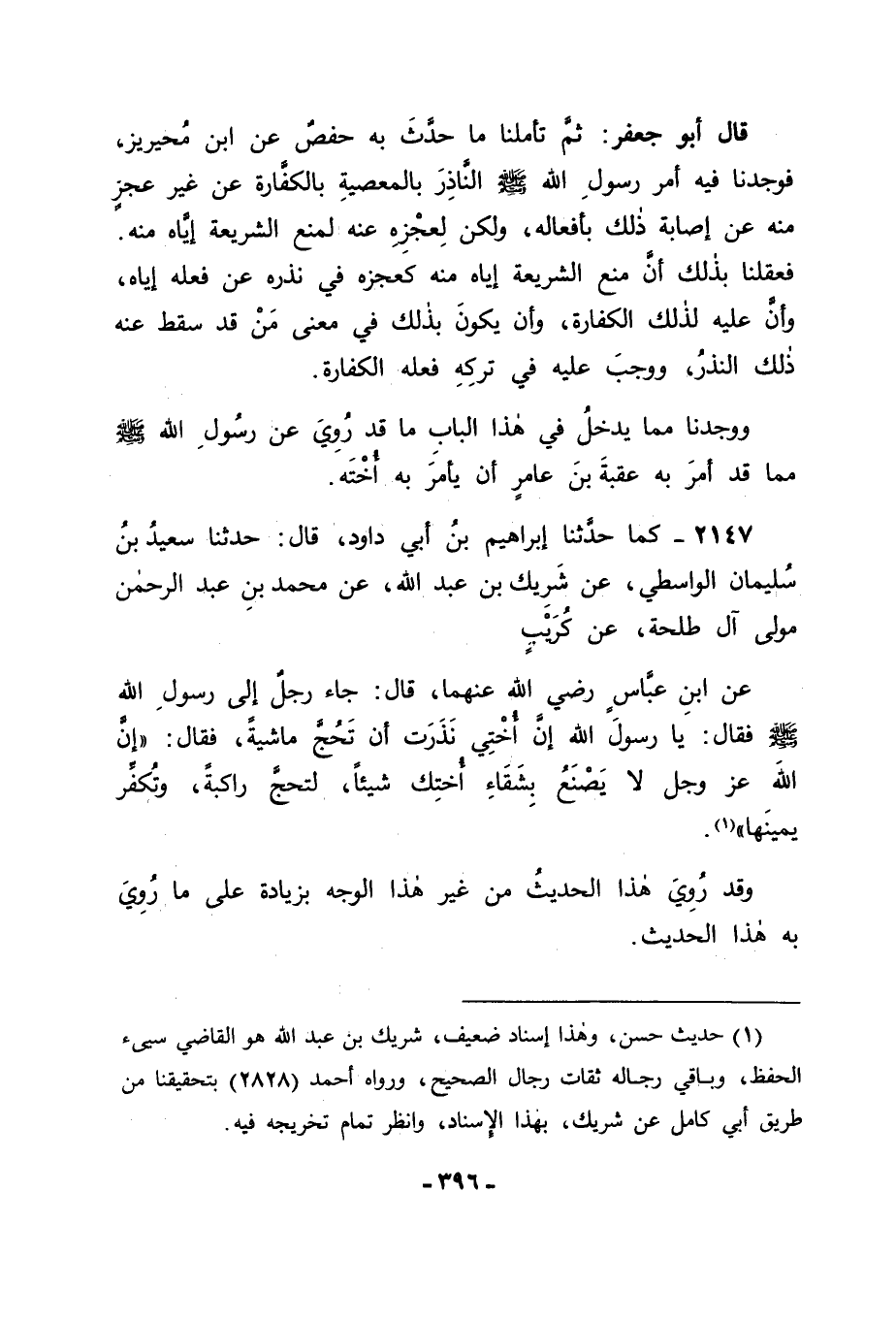2147 - كَمَا حَدَّثَنَا إِبْرَاهِيمُ بْنُ أَبِي دَاوُدَ قَالَ: حَدَّثَنَا سَعِيدُ بْنُ سُلَيْمَانَ الْوَاسِطِيُّ , عَنْ شَرِيكِ بْنِ عَبْدِ اللهِ , عَنْ مُحَمَّدِ بْنِ عَبْدِ الرَّحْمَنِ , مَوْلَى آلِ طَلْحَةَ , عَنْ كُرَيْبٍ , عَنِ ابْنِ عَبَّاسٍ رَضِيَ اللهُ عَنْهُمَا قَالَ: جَاءَ رَجُلٌ إِلَى رَسُولِ اللهِ صَلَّى اللَّهُ عَلَيْهِ وَسَلَّمَ فَقَالَ: يَا رَسُولَ اللهِ , إِنَّ أُخْتِي نَذَرَتْ أَنْ تَحُجَّ مَاشِيَةً. فَقَالَ: " إِنَّ اللهَ عَزَّ وَجَلَّ لَا يَصْنَعُ بِشَقَاءِ أُخْتِكَ شَيْئًا , لِتَحُجَّ رَاكِبَةً وَتُكَفِّرْ يَمِينِهَا ". وَقَدْ رُوِيَ هَذَا الْحَدِيثُ مِنْ غَيْرِ هَذَا الْوَجْهِ بِزِيَادَةٍ عَلَى مَا رُوِيَ بِهِ هَذَا الْحَدِيثُ