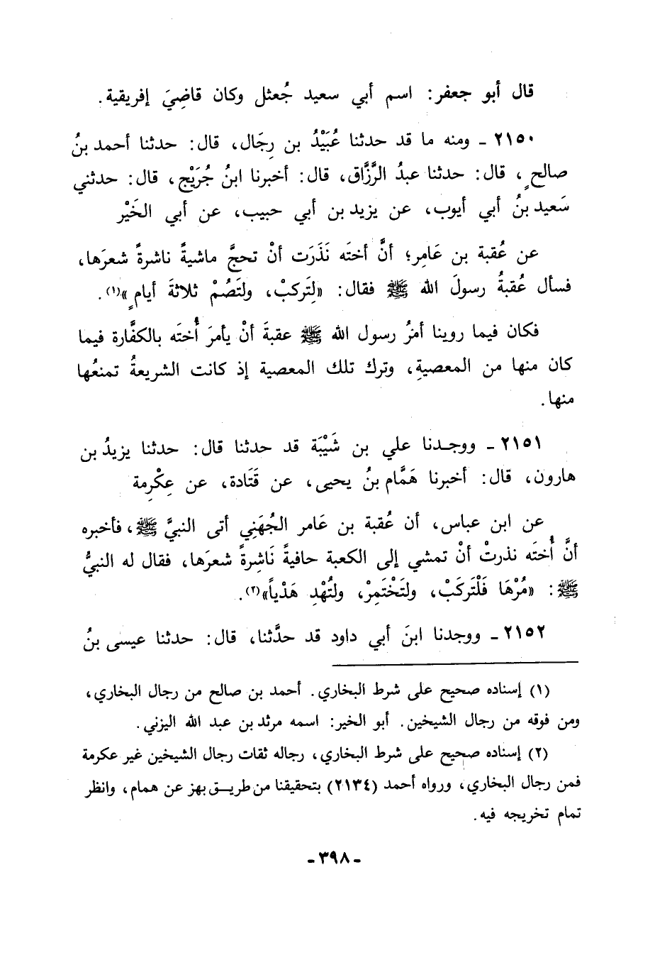 2150 - وَمِنْهُ مَا قَدْ حَدَّثَنَا عُبَيْدُ بْنُ رِجَالٍ قَالَ: حَدَّثَنَا أَحْمَدُ بْنُ صَالِحٍ قَالَ: حَدَّثَنَا عَبْدُ الرَّزَّاقِ قَالَ: أَخْبَرَنَا ابْنُ جُرَيْجٍ قَالَ: حَدَّثَنِي سَعِيدُ بْنُ أَبِي أَيُّوبَ , عَنْ يَزِيدَ بْنِ أَبِي حَبِيبٍ , عَنْ أَبِي الْخَيْرِ , عَنْ عُقْبَةَ بْنِ عَامِرٍ , أَنَّ أُخْتَهُ نَذَرَتْ أَنْ تَحُجَّ مَاشِيَةً نَاشِرَةً شَعْرَهَا , فَسَأَلَ عُقْبَةُ رَسُولَ اللهِ صَلَّى اللَّهُ عَلَيْهِ وَسَلَّمَ , فَقَالَ: " لِتَرْكَبْ , وَلْتَصُمْ ثَلَاثَةَ أَيَّامٍ ". فَكَانَ فِيمَا رَوَيْنَا أَمْرُ رَسُولِ اللهِ صَلَّى اللَّهُ عَلَيْهِ وَسَلَّمَ عُقْبَةَ أَنْ يَأْمُرَ أُخْتَهُ بِالْكَفَّارَةِ فِيمَا كَانَ مِنْهَا مِنَ الْمَعْصِيَةِ , وَتَرْكِ تِلْكَ الْمَعْصِيَةِ إِذْ , كَانَتِ الشَّرِيعَةُ تَمْنَعُهَا مِنْهَا