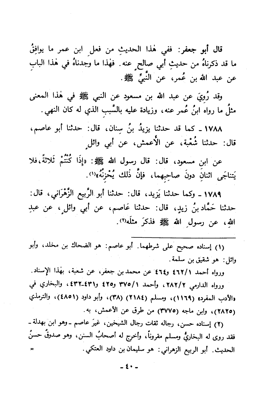 1788 - كَمَا قَدْ حَدَّثَنَا يَزِيدُ بْنُ سِنَانٍ قَالَ حَدَّثَنَا أَبُو عَاصِمٍ قَالَ: حَدَّثَنَا شُعْبَةُ , عَنِ الْأَعْمَشِ , عَنْ أَبِي وَائِلٍ , عَنِ ابْنِ مَسْعُودٍ قَالَ: قَالَ رَسُولُ اللهِ صَلَّى اللَّهُ عَلَيْهِ وَسَلَّمَ " إِذَا كُنْتُمْ ثَلَاثَةً فَلَا يَتَنَاجَ اثْنَانِ دُونَ صَاحِبِهِمَا , فَإِنَّ ذَلِكَ يُحْزِنُهُ ".