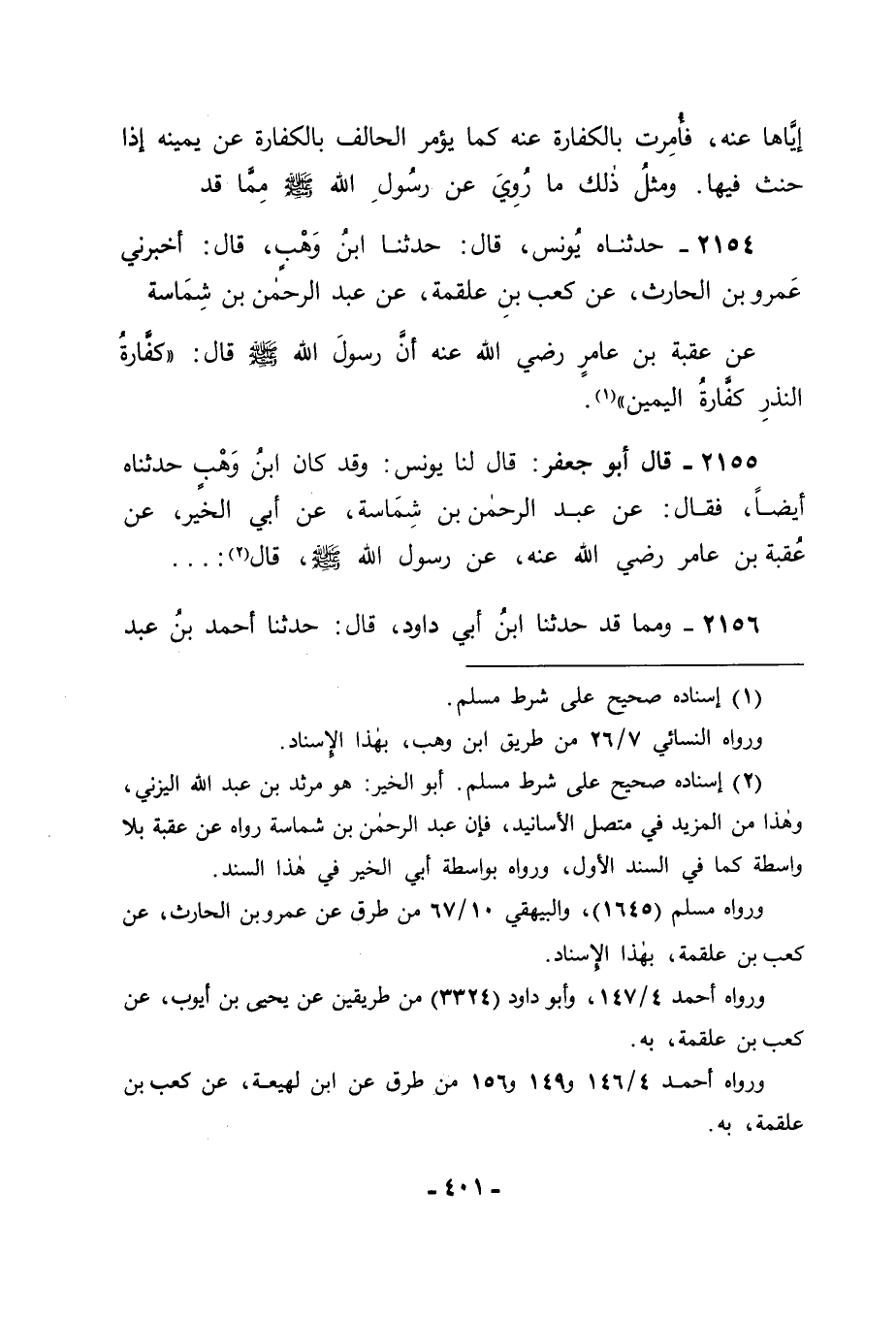 2154 - مِمَّا قَدْ حَدَّثَنَاهُ يُونُسُ قَالَ: حَدَّثَنَا ابْنُ وَهْبٍ قَالَ: أَخْبَرَنِي عَمْرُو بْنُ الْحَارِثِ , عَنْ كَعْبِ بْنِ عَلْقَمَةَ , عَنْ عَبْدِ الرَّحْمَنِ بْنِ شِمَاسَةَ , عَنْ عُقْبَةَ بْنِ عَامِرٍ رَضِيَ اللهُ عَنْهُ , أَنَّ رَسُولَ اللهِ صَلَّى اللَّهُ عَلَيْهِ وَسَلَّمَ قَالَ: " كَفَّارَةُ النَّذْرِ كَفَّارَةُ الْيَمِينِ ".
