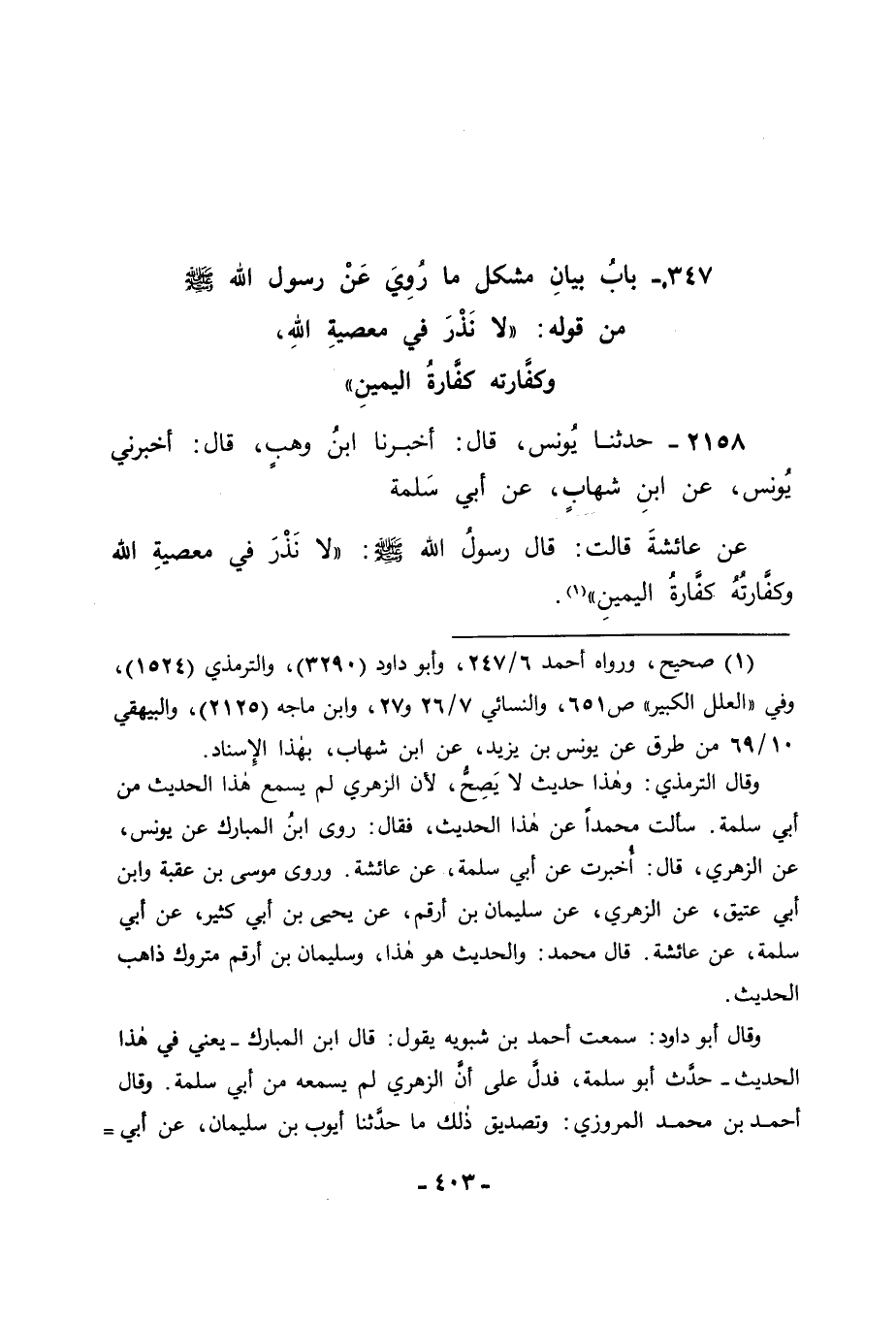 2158 - حَدَّثَنَا يُونُسُ قَالَ: أَخْبَرَنَا ابْنُ وَهْبٍ قَالَ: أَخْبَرَنِي يُونُسُ , عَنِ ابْنِ شِهَابٍ , عَنْ أَبِي سَلَمَةَ , , عَنْ عَائِشَةَ قَالَتْ: قَالَ رَسُولُ اللهِ صَلَّى اللَّهُ عَلَيْهِ وَسَلَّمَ: " لَا نَذْرَ فِي مَعْصِيَةِ اللهِ , وَكَفَّارَتُهُ كَفَّارَةُ الْيَمِينِ ". -[404]- قَالَ أَبُو جَعْفَرٍ: وَكَانَ هَذَا الْحَدِيثُ شَاذًّا لِمَا قَدْ ذَكَرْنَاهُ مِنْ جِنْسِهِ فِي الْبَابِ الْأَوَّلِ , غَيْرَ أَنَّا وَجَدْنَاهُ فَاسِدَ الْإِسْنَادِ