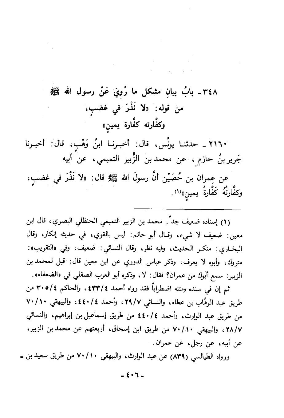 2160 - حَدَّثَنَا يُونُسُ قَالَ: أَخْبَرَنَا ابْنُ وَهْبٍ قَالَ: أَخْبَرَنَا جَرِيرُ بْنُ حَازِمٍ , عَنْ مُحَمَّدِ بْنِ الزُّبَيْرِ التَّمِيمِيِّ , عَنْ أَبِيهِ , عَنْ عِمْرَانَ بْنِ حُصَيْنٍ , أَنَّ رَسُولَ اللهِ صَلَّى اللَّهُ عَلَيْهِ وَسَلَّمَ قَالَ: " لَا نَذْرَ فِي غَضَبٍ , وَكَفَّارَتُهُ كَفَّارَةُ يَمِينٍ ". -[407]-