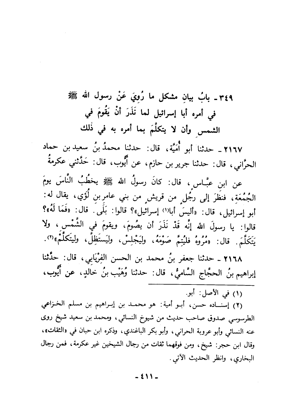 2167 - حَدَّثَنَا أَبُو أُمَيَّةَ قَالَ: حَدَّثَنَا مُحَمَّدُ بْنُ سَعِيدِ بْنِ حَمَّادٍ الْحَرَّانِيُّ قَالَ: حَدَّثَنَا جَرِيرُ بْنُ حَازِمٍ , عَنْ أَيُّوبَ قَالَ: حَدَّثَنِي عِكْرِمَةُ , عَنِ ابْنِ عَبَّاسٍ قَالَ: كَانَ رَسُولُ اللهِ صَلَّى اللَّهُ عَلَيْهِ وَسَلَّمَ يَخْطُبُ النَّاسَ يَوْمَ الْجُمُعَةِ , فَنَظَرَ إِلَى رَجُلٍ مِنْ قُرَيْشٍ مِنْ بَنِي عَامِرِ بْنِ لُؤَيٍّ يُقَالُ لَهُ أَبُو إِسْرَائِيلَ قَالَ: " أَلَيْسَ أَبَا إِسْرَائِيلَ؟ " قَالُوا: بَلَى , قَالَ: " فَمَا لَهُ؟ " قَالُوا: يَا رَسُولَ اللهِ , إِنَّهُ قَدْ نَذَرَ أَنْ يَصُومَ الْيَوْمَ , وَيَقُومَ فِي الشَّمْسِ وَلَا يَتَكَلَّمَ. قَالَ: " مُرُوهُ فَلْيُتِمَّ صَوْمَهُ , وَلْيَجْلِسْ , وَلْيَسْتَظِلَّ , وَلْيَتَكَلَّمْ ".