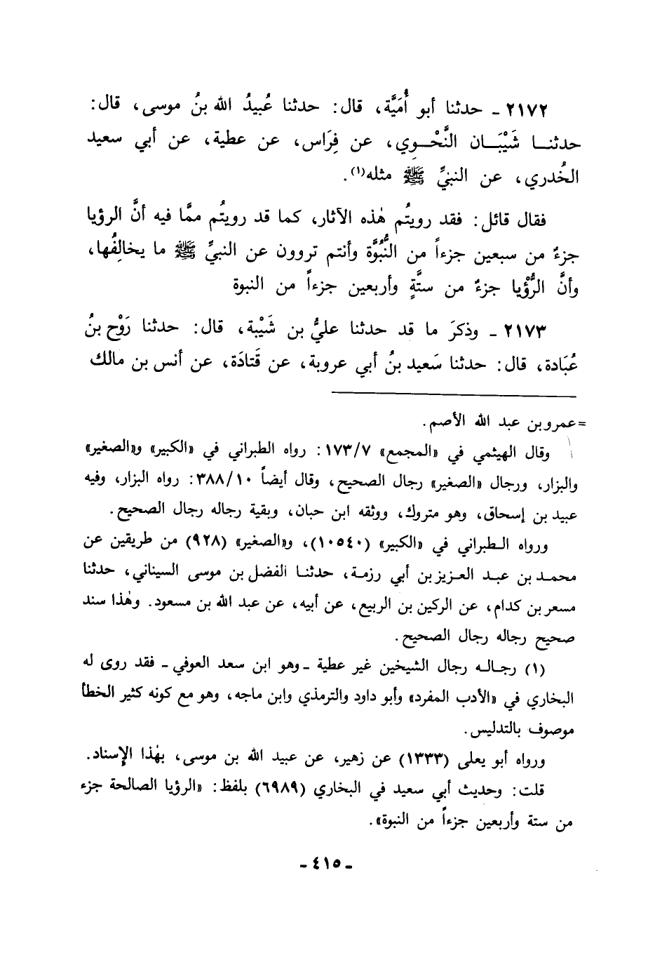 2173 - وَذَكَرَ مَا قَدْ حَدَّثَنَا عَلِيُّ بْنُ شَيْبَةَ قَالَ: حَدَّثَنَا رَوْحُ بْنُ عُبَادَةَ قَالَ: حَدَّثَنَا سَعِيدُ بْنُ أَبِي عَرُوبَةَ , عَنْ قَتَادَةَ , عَنْ أَنَسِ بْنِ مَالِكٍ , -[416]- عَنْ عُبَادَةَ بْنِ الصَّامِتِ قَالَ: قَالَ رَسُولُ اللهِ صَلَّى اللَّهُ عَلَيْهِ وَسَلَّمَ: " رُؤْيَا الْمُسْلِمِ جُزْءٌ مِنْ سِتَّةٍ وَأَرْبَعِينَ جُزْءًا مِنَ النُّبُوَّةِ "