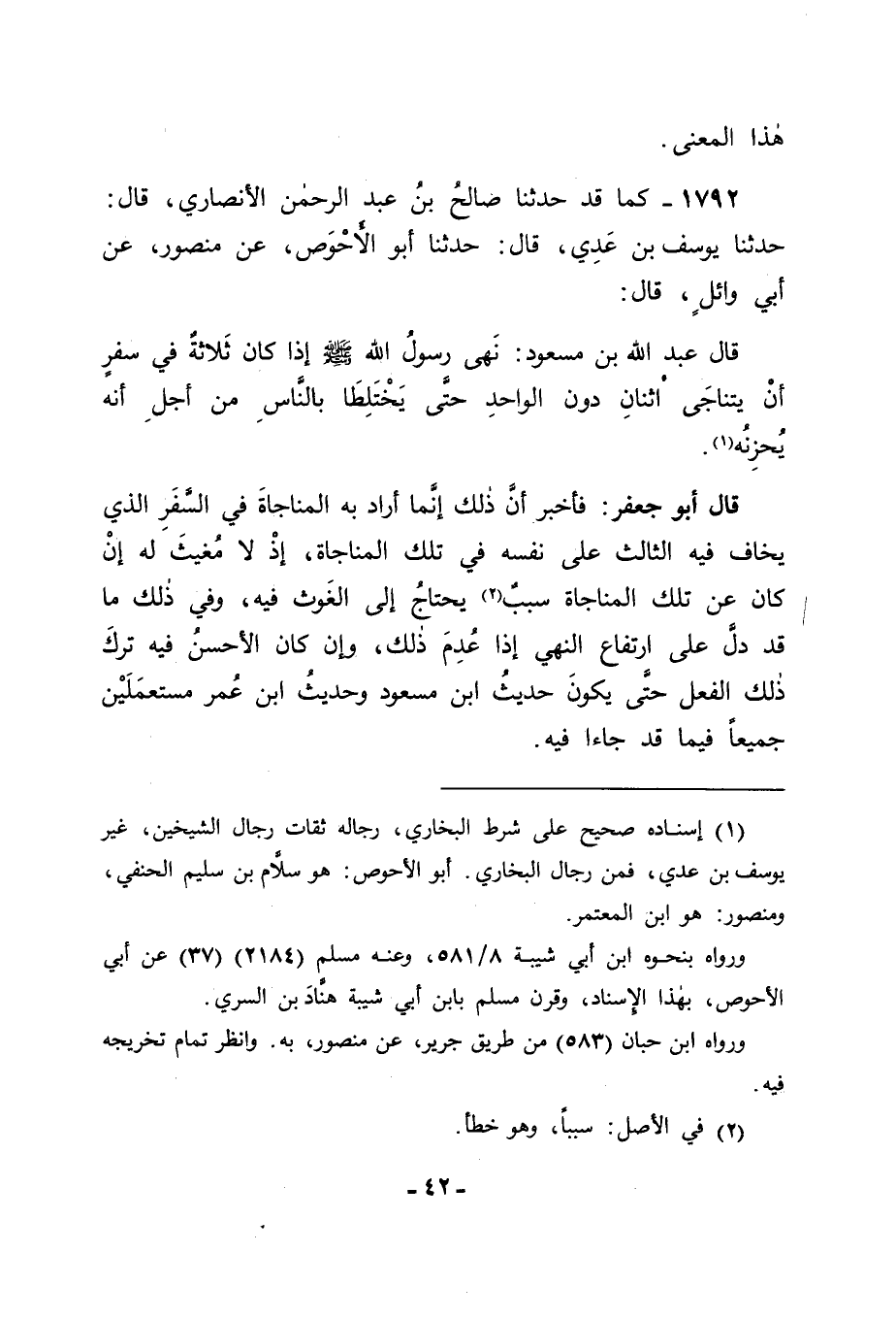 1792 - كَمَا قَدْ حَدَّثَنَا صَالِحُ بْنُ عَبْدِ الرَّحْمَنِ الْأَنْصَارِيُّ قَالَ: حَدَّثَنَا يُوسُفُ بْنُ عَدِيٍّ قَالَ: حَدَّثَنَا أَبُو الْأَحْوَصِ , عَنْ مَنْصُورٍ , عَنْ أَبِي وَائِلٍ قَالَ: قَالَ عَبْدُ اللهِ بْنُ مَسْعُودٍ: نَهَى رَسُولُ اللهِ صَلَّى اللَّهُ عَلَيْهِ وَسَلَّمَ إِذَا كَانَ ثَلَاثَةٌ فِي سَفَرٍ أَنْ يَتَنَاجَى اثْنَانِ دُونَ الْوَاحِدِ حَتَّى يَخْتَلِطَا بِالنَّاسِ , مِنْ أَجْلِ أَنَّهُ يُحْزِنُهُ. قَالَ أَبُو جَعْفَرٍ: فَأَخْبَرَ أَنَّ ذَلِكَ إِنَّمَا أَرَادَ بِهِ الْمُنَاجَاةَ فِي السَّفَرِ الَّذِي يَخَافُ فِيهِ الثَّالِثُ عَلَى نَفْسِهِ فِي تِلْكَ الْمُنَاجَاةِ , إِذْ لَا مُغِيثَ لَهُ إِنْ كَانَ عَنْ تِلْكَ الْمُنَاجَاةِ سَبَبٌ يَحْتَاجُ إِلَى الْغَوْثِ فِيهِ , وَفِي ذَلِكَ مَا قَدْ دَلَّ عَلَى ارْتِفَاعِ النَّهْيِ إِذَا عُدِمَ ذَلِكَ , وَإِنْ كَانَ الْأَحْسَنَ فِيهِ تَرْكُ ذَلِكَ الْفِعْلِ حَتَّى يَكُونَ حَدِيثُ ابْنِ مَسْعُودٍ وَحَدِيثُ ابْنِ عُمَرَ مُسْتَعْمَلَيْنِ جَمِيعًا فِيمَا قَدْ جَاءَا فِيهِ , -[43]- فَإِنْ قَالَ قَائِلٌ: لَمْ يُرْوَ هَذَا الْحَدِيثُ بِذِكْرِ السَّفَرِ إِلَّا فِي حَدِيثِ صَالِحٍ الَّذِي قَدْ ذَكَرْتَ. قِيلَ لَهُ: وَمَا تُنْكِرُ مِنْهُ مَعَ صِحَّةِ مَخْرَجِهِ , وَقَدْ رُوِيَ مِنْ طَرِيقٍ آخَرَ مِنْ كَلَامِ ابْنِ مَسْعُودٍ مِنْ مَا نَعْلَمُ أَنَّهُ لَمْ يَقُلْهُ مِنْ رَأْيِهِ إِذْ كَانَ مِثْلُهُ لَا يُقَالُ بِالرَّأْيِ , وَلَكِنَّهُ قَالَهُ لِأَخْذِهِ إِيَّاهُ عَنْ رَسُولِ اللهِ صَلَّى اللَّهُ عَلَيْهِ وَسَلَّمَ