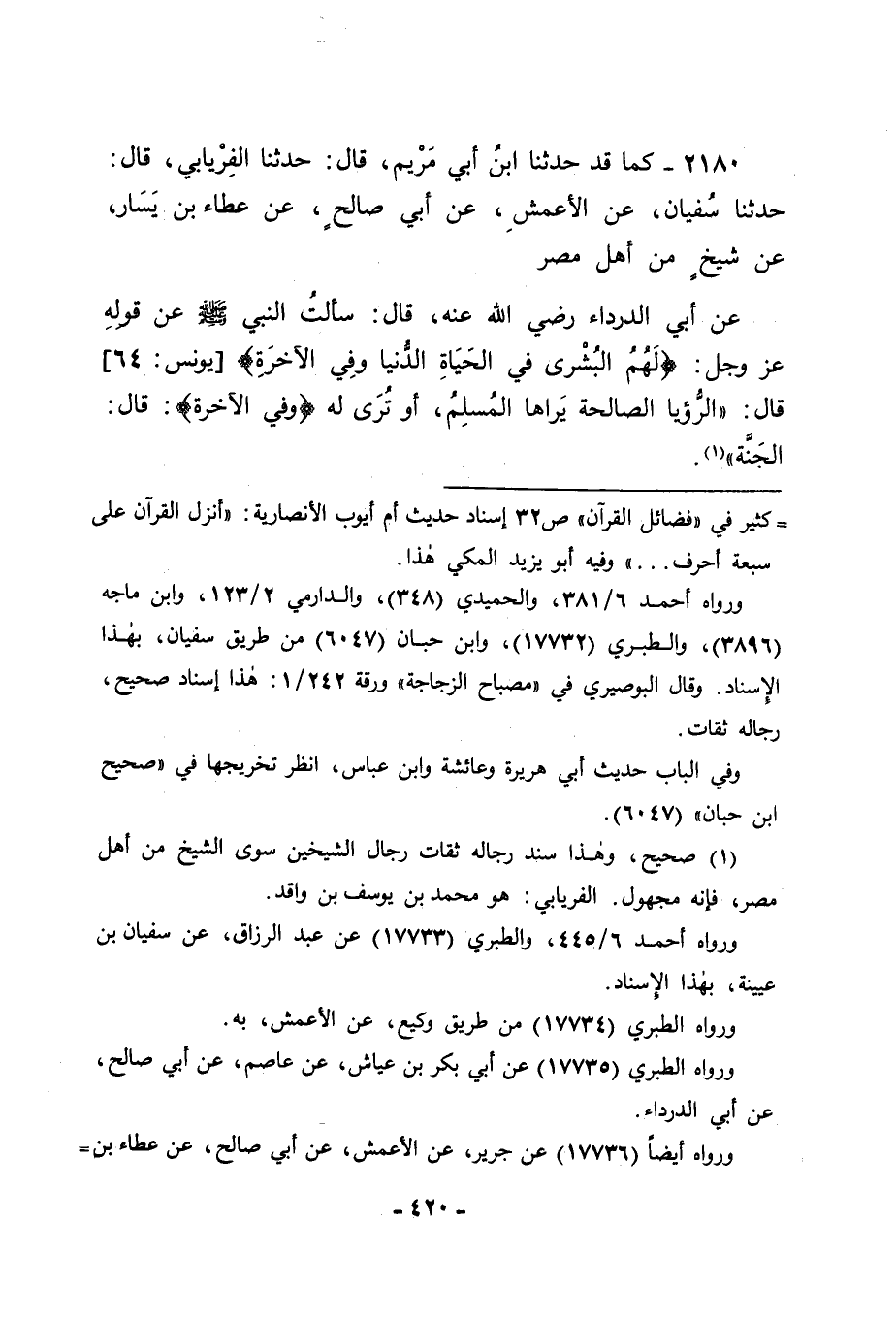 2180 - كَمَا قَدْ حَدَّثَنَا ابْنُ أَبِي مَرْيَمَ قَالَ: حَدَّثَنَا الْفِرْيَابِيُّ قَالَ: حَدَّثَنَا سُفْيَانُ , عَنِ الْأَعْمَشِ , عَنْ أَبِي صَالِحٍ , عَنْ عَطَاءِ بْنِ يَسَارٍ , عَنْ شَيْخٍ مِنْ أَهْلِ مِصْرَ , عَنْ أَبِي الدَّرْدَاءِ رَضِيَ اللهُ عَنْهُ قَالَ: سَأَلْتُ النَّبِيَّ صَلَّى اللَّهُ عَلَيْهِ وَسَلَّمَ عَنْ قَوْلِهِ عَزَّ وَجَلَّ: {لَهُمُ الْبُشْرَى فِي الْحَيَاةِ الدُّنْيَا وَفِي الْآخِرَةِ} [يونس: 64] قَالَ: " الرُّؤْيَا الصَّالِحَةُ يَرَاهَا الْمُسْلِمُ , أَوْ تُرَى لَهُ , {وَفِي الْآخِرَةِ} [يونس: 64] قَالَ: الْجَنَّةُ ". -[421]- فَاحْتُمِلَ أَنْ يَكُونَ اللهُ عَزَّ وَجَلَّ كَانَ جَعَلَهَا فِي الْبَدْءِ جُزْءًا مِنْ -[422]- سَبْعِينَ جُزْءًا مِنَ النُّبُوَّةِ , فَيَكُونُ مَا يُعْطَى مَنْ رَآهَا أَوْ رُئِيَتْ لَهُ بِهَا ذَلِكَ الْجُزْءَ مِنَ النُّبُوَّةِ فَضْلًا مِنْهُ عَلَيْهِ , وَعَطِيَّةً مِنْهُ إِيَّاهُ , ثُمَّ زَادَهُ بَعْدَ ذَلِكَ أَنْ يَجْعَلَ مَا يُعْطِيهِ بِهَا جُزْءًا مِنْ خَمْسِينَ جُزْءًا مِنَ النُّبُوَّةِ , ثُمَّ زَادَهُ بَعْدَ ذَلِكَ أَنْ جَعَلَ مَا يُعْطِيهِ بِهَا جُزْءًا مِنْ سِتَّةٍ وَأَرْبَعِينَ جُزْءًا مِنَ النُّبُوَّةِ. فَإِنْ قَالَ قَائِلٌ: وَكَيْفَ لَمْ يَجُزْ أَنْ يَكُونَ قَلِيلُهَا هُوَ النَّاسِخُ لِكَثِيرِهَا؟ فَكَانَ جَوَابَنَا لَهُ فِي ذَلِكَ بِتَوْفِيقِ اللهِ عَزَّ وَجَلَّ وَعَوْنِهِ: أَنَّ اللهَ عَزَّ وَجَلَّ لَا يَنْتَزِعُ مِنْ عِبَادِهِ فَضْلًا تَفَضَّلَ بِهِ عَلَيْهِمْ إِلَّا بِحَادِثَةٍ يُحْدِثُونَهَا يَسْتَحِقُّونَ بِهَا ذَلِكَ مِنْهُ , كَمَا قَالَ اللهُ عَزَّ وَجَلَّ: {فَبِظُلْمٍ مِنَ الَّذِينَ هَادُوا حَرَّمْنَا عَلَيْهِمْ طَيِّبَاتٍ أُحِلَّتْ لَهُمْ} [النساء: 160] الْآيَةَ. وَكَمَا قَالَ اللهُ عَزَّ وَجَلَّ: {ذَلِكَ بِأَنَّ اللهَ لَمْ يَكُ مُغَيِّرًا نِعْمَةً أَنْعَمَهَا عَلَى قَوْمٍ حَتَّى يُغَيِّرُوا مَا بِأَنْفُسِهِمْ} [الأنفال: 53] فَلَمْ يَكُنْ مِمَّنْ أَنْعَمَ عَلَيْهِ عَزَّ وَجَلَّ بِكَثِيرٍ مِنْ أَجْزَاءِ النُّبُوَّةِ مَا يَسْتَحِقُّونَ بِهِ حِرْمَانَ ذَلِكَ وَالرَّدَّ إِلَى قَلِيلِ أَجْزَائِهَا , وَاللهَ نَسْأَلُهُ التَّوْفِيقَ