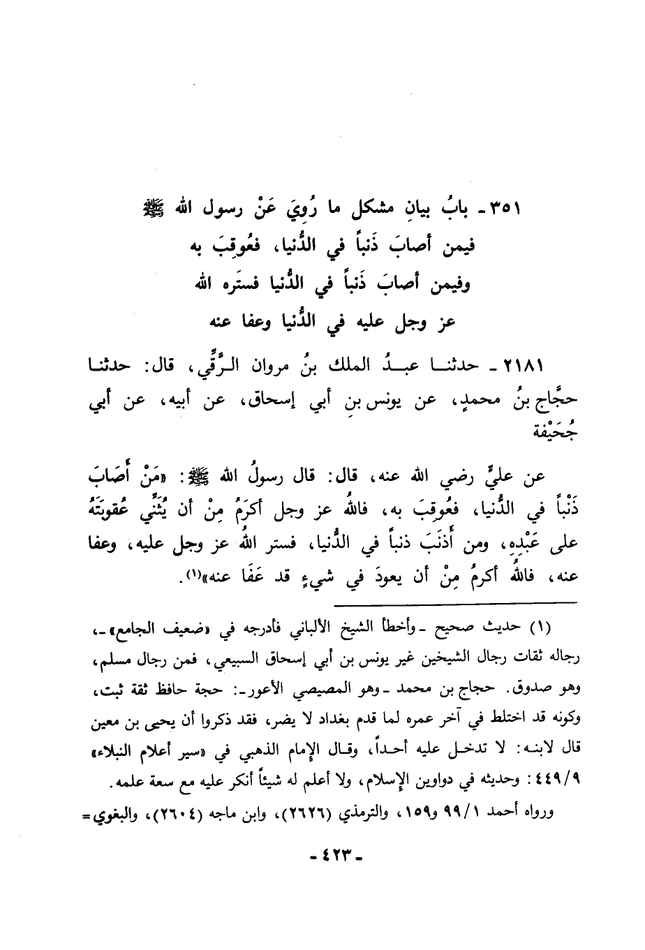 2181 - حَدَّثَنَا عَبْدُ الْمَلِكِ بْنُ مَرْوَانَ الرَّقِّيُّ قَالَ: حَدَّثَنَا حَجَّاجُ بْنُ مُحَمَّدٍ , عَنْ يُونُسَ بْنِ أَبِي إِسْحَاقَ , عَنْ أَبِيهِ , عَنْ أَبِي جُحَيْفَةَ , عَنْ عَلِيٍّ رَضِيَ اللهُ عَنْهُ قَالَ: قَالَ رَسُولُ اللهِ صَلَّى اللَّهُ عَلَيْهِ وَسَلَّمَ: " مَنْ أَصَابَ ذَنْبًا فِي الدُّنْيَا فَعُوقِبَ بِهِ , فَاللهُ عَزَّ وَجَلَّ أَكْرَمُ مِنْ أَنْ يُثَنِّيَ عُقُوبَتَهُ عَلَى عَبْدِهِ , وَمَنْ أَذْنَبَ ذَنْبًا فِي الدُّنْيَا , فَسَتَرَ اللهُ عَزَّ وَجَلَّ عَلَيْهِ وَعَفَا عَنْهُ , فَاللهُ أَكْرَمُ مِنْ أَنْ يَعُودَ فِي شَيْءٍ قَدْ عَفَا عَنْهُ "