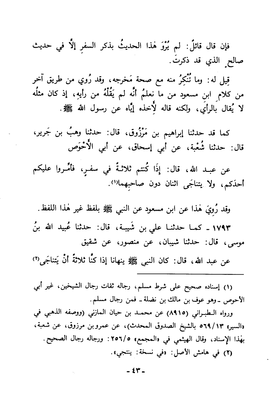 كَمَا قَدْ حَدَّثَنَا إِبْرَاهِيمُ بْنُ مَرْزُوقٍ قَالَ: حَدَّثَنَا وَهْبُ بْنُ جَرِيرٍ قَالَ: حَدَّثَنَا شُعْبَةُ , عَنْ أَبِي إِسْحَاقَ , عَنْ أَبِي الْأَحْوَصِ , عَنْ عَبْدِ اللهِ قَالَ: " إِذَا كُنْتُمْ ثَلَاثَةً فِي سَفَرٍ فَأَمِّرُوا عَلَيْكُمْ أَحَدَكُمْ , وَلَا يَتَنَاجَ اثْنَانِ دُونَ صَاحِبِهِمَا " وَقَدْ رُوِيَ هَذَا عَنِ ابْنِ مَسْعُودٍ , عَنِ النَّبِيِّ صَلَّى اللَّهُ عَلَيْهِ وَسَلَّمَ بِلَفْظٍ غَيْرِ هَذَا اللَّفْظِ