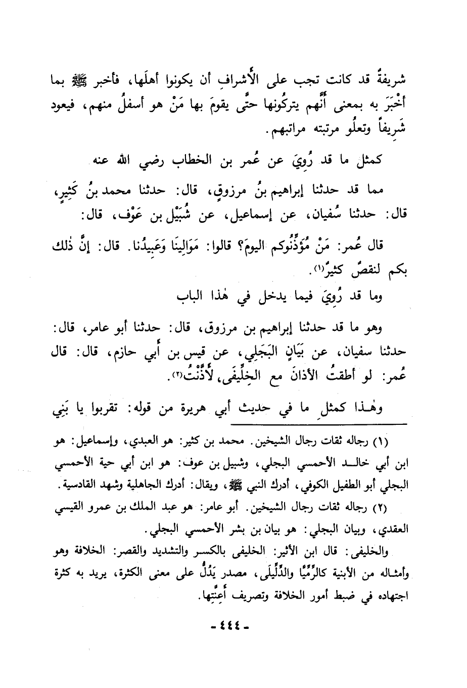 مِمَّا قَدْ حَدَّثَنَا إِبْرَاهِيمُ بْنُ مَرْزُوقٍ قَالَ: حَدَّثَنَا مُحَمَّدُ بْنُ كَثِيرٍ قَالَ: حَدَّثَنَا سُفْيَانُ , عَنْ إِسْمَاعِيلَ , عَنْ شُبَيْلِ بْنِ عَوْفٍ قَالَ: قَالَ: عُمَرُ: " مَنْ مُؤَذِّنُوكُمُ الْيَوْمَ؟ قَالُوا: مَوَالِينَا وَعَبِيدُنَا , قَالَ: إِنَّ ذَلِكَ بِكُمْ لَنَقْصٌ كَثِيرٌ ". وَمَا قَدْ رُوِيَ فِيمَا يَدْخُلُ فِي هَذَا الْبَابِ
