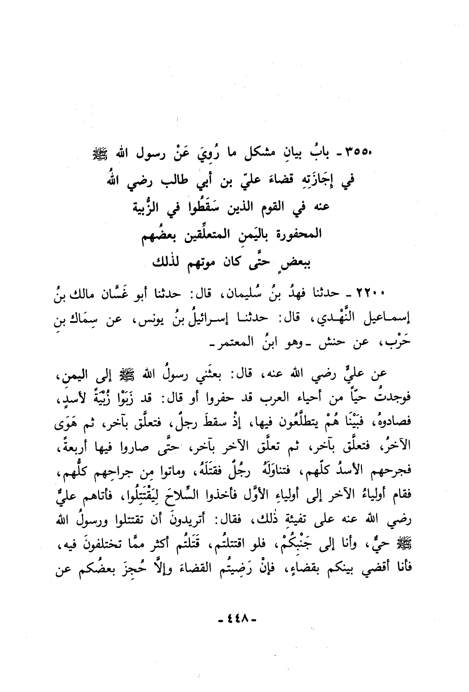 2200 - حَدَّثَنَا فَهْدُ بْنُ سُلَيْمَانَ قَالَ: حَدَّثَنَا أَبُو غَسَّانَ مَالِكُ بْنُ إِسْمَاعِيلَ النَّهْدِيُّ قَالَ: حَدَّثَنَا إِسْرَائِيلُ بْنُ يُونُسَ , عَنْ سِمَاكِ بْنِ حَرْبٍ , عَنْ حَنَشٍ وَهُوَ ابْنُ الْمُعْتَمِرِ , عَنْ عَلِيٍّ رَضِيَ اللهُ عَنْهُ قَالَ: بَعَثَنِي رَسُولُ اللهِ صَلَّى اللَّهُ عَلَيْهِ وَسَلَّمَ إِلَى الْيَمَنِ , فَوَجَدْتُ حَيًّا مِنْ أَحْيَاءِ الْعَرَبِ قَدْ حَفَرُوا , أَوْ قَالَ: قَدْ زَبَوْا زُبْيَةً لِأَسَدٍ , فَصَادُوهُ , فَبَيْنَا هُمْ يَتَطَلَّعُونَ فِيهَا , إِذْ سَقَطَ رَجُلٌ , فَتَعَلَّقَ بِآخَرَ , ثُمَّ هَوَى الْآخَرُ , فَتَعَلَّقَ بِآخَرَ , ثُمَّ تَعَلَّقَ الْآخَرُ بِآخَرَ , حَتَّى صَارُوا فِيهَا أَرْبَعَةً , فَجَرَحَهُمُ الْأَسَدُ كُلَّهُمْ , فَتَنَاوَلَهُ رَجُلٌ فَقَتَلَهُ , وَمَاتُوا مِنْ جِرَاحِهِمْ كُلُّهُمْ , فَقَامَ أَوْلِيَاءُ الْآخِرِ إِلَى أَوْلِيَاءِ الْأَوَّلِ فَأَخَذُوا السِّلَاحَ لِيَقْتَتِلُوا , فَأَتَاهُمْ عَلِيٌّ رَضِيَ اللهُ عَنْهُ عَلَى تَفِيئَةِ ذَلِكَ , فَقَالَ: أَتُرِيدُونَ أَنْ تَقْتَتِلُوا وَرَسُولُ اللهِ صَلَّى اللَّهُ عَلَيْهِ وَسَلَّمَ حَيٌّ , وَأَنَا إِلَى جَنْبِكُمْ , فَلَوِ اقْتَتَلْتُمْ قَتَلْتُمْ أَكْثَرَ مِمَّا تَخْتَلِفُونَ فِيهِ , فَأَنَا أَقْضِي بَيْنَكُمْ بِقَضَاءٍ , فَإِنْ رَضِيتُمُ الْقَضَاءَ وَإِلَّا حُجِزَ بَعْضُكُمْ عَنْ -[449]- بَعْضٍ حَتَّى تَأْتُوا رَسُولَ اللهِ صَلَّى اللَّهُ عَلَيْهِ وَسَلَّمَ , فَيَكُونَ هُوَ الَّذِي يَقْضِي بَيْنَكُمْ , فَمَنْ عَدَا بَعْدَ ذَلِكَ فَلَا حَقَّ لَهُ. اجْمَعُوا مِنَ الْقَبَائِلِ الَّذِينَ حَضَرُوا الْبِئْرَ رُبُعَ الدِّيَةِ , وَثُلُثَ الدِّيَةِ , وَنِصْفَ الدِّيَةِ , وَالدِّيَةَ كَامِلَةً , فَلِلْأَوَّلِ رُبُعُ الدِّيَةِ؛ لِأَنَّهُ هَلَكَ مِنْ فَوْقِهِ ثَلَاثَةٌ , وَلِلَّذِي يَلِيهِ ثُلُثُ الدِّيَةِ؛ لِأَنَّهُ هَلَكَ مِنْ فَوْقِهِ اثْنَانِ , وَلِلثَّالِثِ نِصْفُ الدِّيَةِ؛ لِأَنَّهُ هَلَكَ مِنْ فَوْقِهِ وَاحِدٌ , وَلِلرَّابِعِ الدِّيَةُ كَامِلَةً. فَأَبَوْا أَنْ يَرْضَوْا , فَأَتَوْا رَسُولَ اللهِ صَلَّى اللَّهُ عَلَيْهِ وَسَلَّمَ فَلَقُوهُ عِنْدَ مَقَامِ إِبْرَاهِيمَ صَلَّى اللَّهُ عَلَيْهِ وَسَلَّمَ , وَقَصُّوا عَلَيْهِ الْقِصَّةَ , فَقَالَ: " أَنَا أَقْضِي بَيْنَكُمْ " وَاحْتَبَى بِبُرْدِهِ , فَقَالَ رَجُلٌ مِنَ الْقَوْمِ: إِنَّ عَلِيًّا قَدْ قَضَى بَيْنَنَا , فَلَمَّا قَصُّوا عَلَيْهِ الْقِصَّةَ أَجَازَهُ