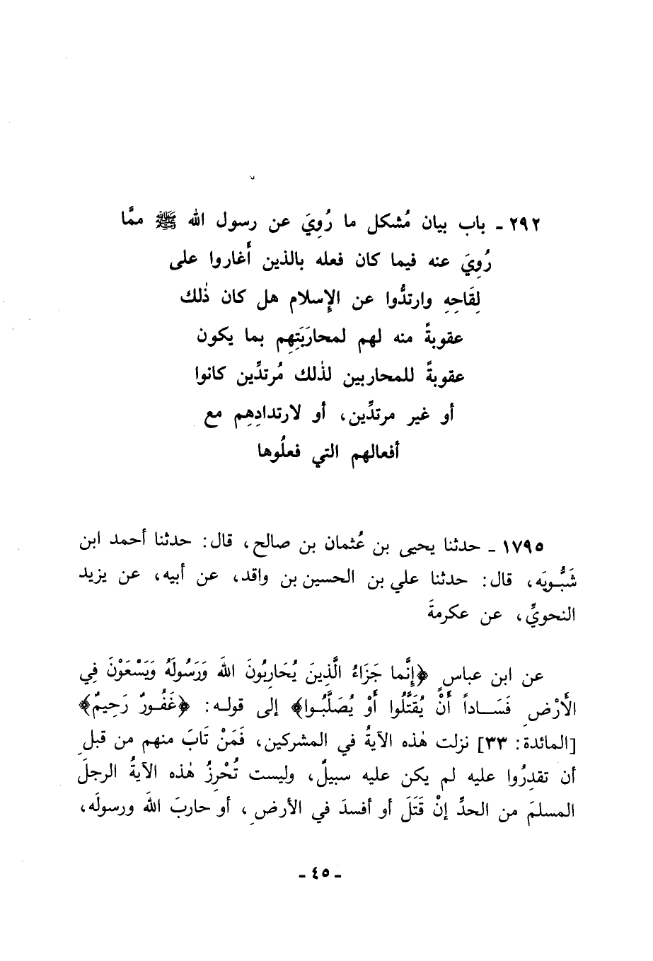 1795 - حَدَّثَنَا يَحْيَى بْنُ عُثْمَانَ بْنِ صَالِحٍ قَالَ: حَدَّثَنَا أَحْمَدُ بْنُ شَبُّوَيْهِ قَالَ: حَدَّثَنَا عَلِيُّ بْنُ الْحُسَيْنِ بْنِ وَاقِدٍ , عَنْ أَبِيهِ , عَنْ يَزِيدَ النَّحْوِيِّ , عَنْ عِكْرِمَةَ , عَنِ ابْنِ عَبَّاسٍ , {إِنَّمَا جَزَاءُ الَّذِينَ يُحَارِبُونَ اللهَ وَرَسُولَهُ وَيَسْعَوْنَ فِي الْأَرْضِ فَسَادًا أَنْ يُقَتَّلُوا أَوْ يُصَلَّبُوا} [المائدة: 33] إِلَى قَوْلِهِ {غَفُورٌ رَحِيمٌ} [البقرة: 173] نَزَلَتْ هَذِهِ الْآيَةُ فِي الْمُشْرِكِينَ , فَمَنْ تَابَ مِنْهُمْ مِنْ قَبْلِ أَنْ تَقْدِرُوا عَلَيْهِ لَمْ يَكُنْ عَلَيْهِ سَبِيلٌ , وَلَيْسَتْ تُحْرِزُ هَذِهِ الْآيَةُ الرَّجُلَ الْمُسْلِمَ مِنَ الْحَدِّ إِنْ قَتَلَ أَوْ أَفْسَدَ فِي الْأَرْضِ أَوْ حَارَبَ اللهَ وَرَسُولَهُ , -[46]- ثُمَّ لَحِقَ بِالْكُفَّارِ قَبْلَ أَنْ يُقْدَرَ عَلَيْهِ , لَمْ يَمْنَعْهُ ذَلِكَ أَنْ يُقَامَ فِيهِ الْحَدُّ الَّذِي أَصَابَهُ