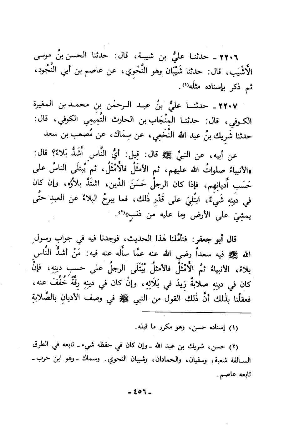 2207 - حَدَّثَنَا عَلِيُّ بْنُ عَبْدِ الرَّحْمَنِ بْنِ مُحَمَّدِ بْنِ الْمُغِيرَةِ الْكُوفِيُّ قَالَ: حَدَّثَنَا الْمِنْجَابُ بْنُ الْحَارِثِ التَّمِيمِيُّ الْكُوفِيُّ قَالَ: حَدَّثَنَا شَرِيكُ بْنُ عَبْدِ اللهِ النَّخَعِيُّ , عَنْ سِمَاكٍ , عَنْ مُصْعَبِ بْنِ سَعْدٍ , عَنْ أَبِيهِ , عَنِ النَّبِيِّ صَلَّى اللَّهُ عَلَيْهِ وَسَلَّمَ قَالَ: قِيلَ: أَيُّ النَّاسِ أَشَدُّ بَلَاءً؟ قَالَ: " الْأَنْبِيَاءُ صَلَوَاتُ اللهِ عَلَيْهِمْ , ثُمَّ الْأَمْثَلُ فَالْأَمْثَلُ , ثُمَّ يُبْتَلَى النَّاسُ عَلَى حَسَبِ أَدْيَانِهِمْ , فَإِذَا كَانَ الرَّجُلُ حَسَنَ الدِّينِ اشْتَدَّ بَلَاؤُهُ , وَإِنْ كَانَ فِي دِينِهِ شَيْءٌ ابْتُلِيَ عَلَى قَدْرِ ذَلِكَ , فَمَا يَبْرَحُ الْبَلَاءُ عَنِ الْعَبْدِ حَتَّى يَمْشِيَ عَلَى الْأَرْضِ وَمَا عَلَيْهِ مِنْ ذَنْبٍ ". قَالَ أَبُو جَعْفَرٍ: فَتَأَمَّلْنَا هَذَا الْحَدِيثَ فَوَجَدْنَا فِيهِ فِي جَوَابِ رَسُولِ اللهِ صَلَّى اللَّهُ عَلَيْهِ وَسَلَّمَ فِيهِ سَعْدًا رَضِيَ اللهُ عَنْهُ عَمَّا سَأَلَهُ عَنْهُ فِيهِ: مَنْ أَشَدُّ النَّاسِ بَلَاءً , الْأَنْبِيَاءُ ثُمَّ الْأَمْثَلُ فَالْأَمْثَلُ , يُبْتَلَى الرَّجُلُ عَلَى حَسَبِ دِينِهِ , فَإِنْ كَانَ فِي دِينِهِ صَلَابَةٌ زِيدَ فِي بَلَائِهِ , وَإِنْ كَانَ فِي دِينِهِ رِقَّةٌ خُفِّفَ عَنْهُ , فَعَقَلْنَا بِذَلِكَ أَنَّ ذَلِكَ الْقَوْلَ مِنَ النَّبِيِّ صَلَّى اللَّهُ عَلَيْهِ وَسَلَّمَ فِي وَصْفِ الْأَدْيَانِ بِالصَّلَابَةِ -[457]- وَالرِّقَّةِ لَمْ يَرْجِعْ عَلَى الْأَنْبِيَاءِ صَلَوَاتُ اللهِ عَلَيْهِمْ؛ لِأَنَّهُمْ لَا رِقَّةَ فِي أَدْيَانِهِمْ , وَأَنَّ ذَلِكَ إِنَّمَا يَرْجِعُ عَلَى مَنْ سِوَاهُمْ مِمَّنْ ذَكَرَ مَعَهُمْ. وَكَانَ فِي هَذَا الْحَدِيثِ أَنَّ الْمُسْلِمِينَ سِوَاهُمْ يُحَطُّ عَنْهُمْ بِالْبَلَاءِ الَّذِي يُبْتَلَوْنَ بِهِ فِي الدُّنْيَا خَطِيئَاتِهِمْ. وَذَلِكَ عِنْدَنَا , وَاللهُ أَعْلَمُ , لِاحْتِسَابِهِمْ عِنْدَ ذَلِكَ وَصَبْرِهِمْ عَلَيْهِ فَتُمَحَّصُ عَنْهُمْ خَطِيئَاتُهُمْ بِذَلِكَ إِذَا كَانُوا ذَوِي خَطَايَا , وَإِذَا كَانَ الْأَنْبِيَاءُ صَلَوَاتُ اللهِ عَلَيْهِمْ فِي ذَلِكَ بِخِلَافِهِمْ؛ لِأَنَّهُمْ لَا خَطَايَا لَهُمْ. وَبِاللهِ التَّوْفِيقُ