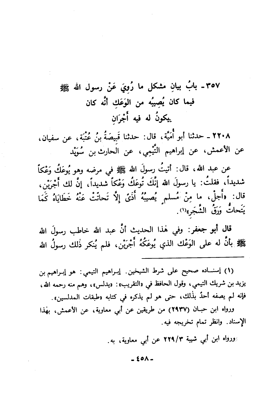 2208 - حَدَّثَنَا أَبُو أُمَيَّةَ قَالَ: حَدَّثَنَا قَبِيصَةُ بْنُ عُقْبَةَ , عَنْ سُفْيَانَ , عَنِ الْأَعْمَشِ , عَنْ إِبْرَاهِيمَ التَّيْمِيِّ , عَنِ الْحَارِثِ بْنِ سُوَيْدٍ , عَنْ عَبْدِ اللهِ قَالَ: أَتَيْتُ رَسُولَ اللهِ صَلَّى اللَّهُ عَلَيْهِ وَسَلَّمَ فِي مَرَضِهِ وَهُوَ يُوعَكُ وَعْكًا شَدِيدًا , فَقُلْتُ: يَا رَسُولَ اللهِ , إِنَّكَ تُوعَكُ وَعْكًا شَدِيدًا , إِنَّ لَكَ أَجْرَيْنِ , قَالَ: " أَجَلْ مَا مِنْ مُسْلِمٍ يُصِيبُهُ أَذًى إِلَّا تَحَاتَّتْ عَنْهُ خَطَايَاهُ كَمَا يَتَحَاتُّ وَرَقُ الشَّجَرِ " قَالَ أَبُو جَعْفَرٍ: وَفِي هَذَا الْحَدِيثِ أَنَّ عَبْدَ اللهِ خَاطَبَ رَسُولَ اللهِ صَلَّى اللَّهُ عَلَيْهِ وَسَلَّمَ بِأَنَّ لَهُ عَلَى الْوَعْكِ الَّذِي يُوعَكُهُ أَجْرَيْنِ , فَلَمْ يُنْكِرْ ذَلِكَ رَسُولُ اللهِ صَلَّى اللَّهُ عَلَيْهِ وَسَلَّمَ , -[459]- فَدَلَّ ذَلِكَ عَلَى أَنَّ الْأَجْرَ قَدْ كَانَ يُكْتَبُ فِي الْوَعْكِ الَّذِي يُوعَكُهُ