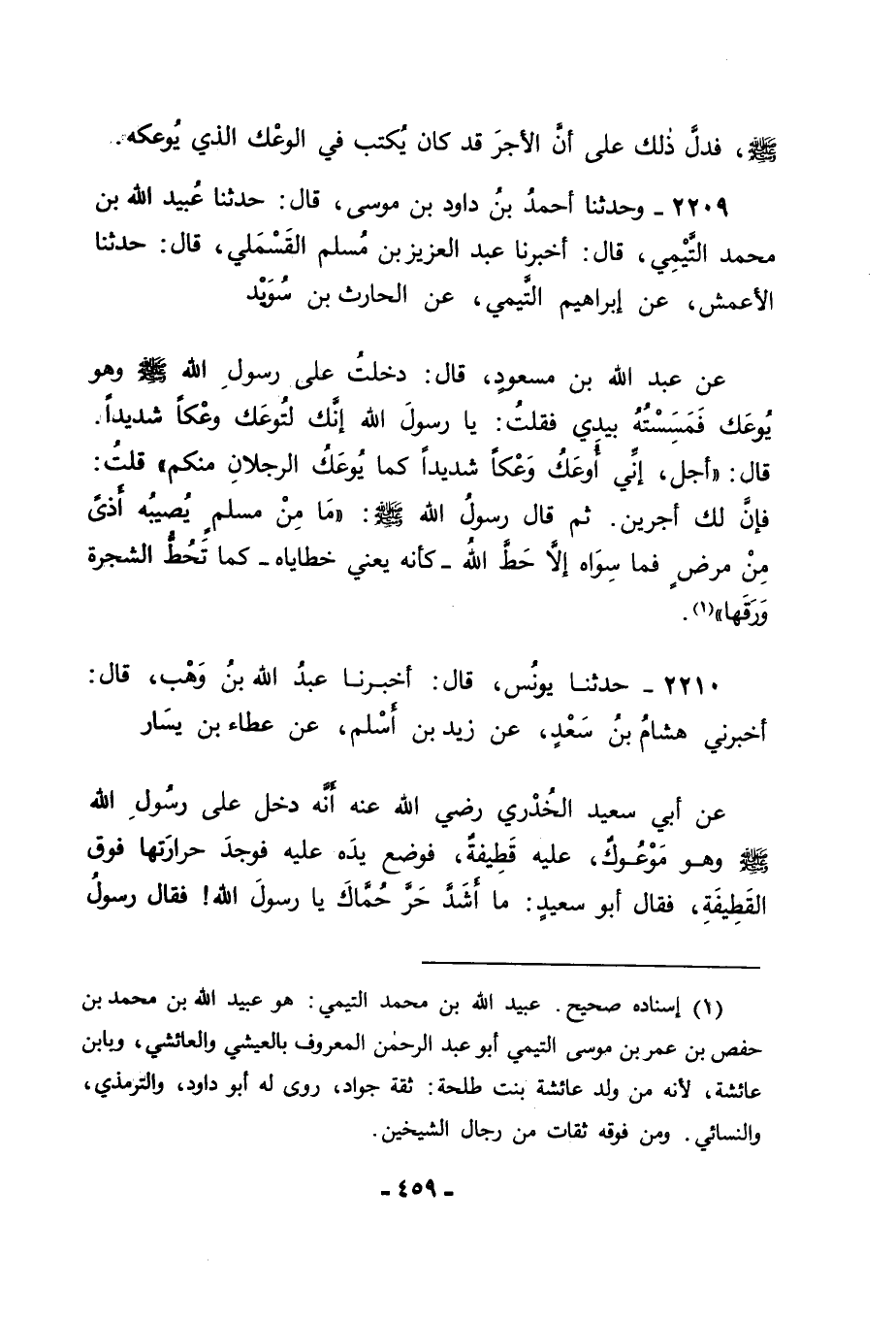 2209 - وَحَدَّثَنَا أَحْمَدُ بْنُ دَاوُدَ بْنِ مُوسَى قَالَ: حَدَّثَنَا عُبَيْدُ اللهِ بْنُ مُحَمَّدٍ التَّيْمِيُّ قَالَ: حَدَّثَنَا عَبْدُ الْعَزِيزِ بْنُ مُسْلِمٍ الْقَسْمَلِيُّ قَالَ: حَدَّثَنَا الْأَعْمَشُ , عَنْ إِبْرَاهِيمَ التَّيْمِيِّ , عَنِ الْحَارِثِ بْنِ سُوَيْدٍ , عَنْ عَبْدِ اللهِ بْنِ مَسْعُودٍ قَالَ: دَخَلْتُ عَلَى رَسُولِ اللهِ صَلَّى اللَّهُ عَلَيْهِ وَسَلَّمَ وَهُوَ يُوعَكُ فَمَسَسْتُهُ بِيَدِي فَقُلْتُ: يَا رَسُولَ اللهِ , إِنَّكَ لَتُوعَكُ وَعْكًا شَدِيدًا؟ قَالَ: " أَجَلْ , إِنِّي أُوعَكُ وَعْكًا شَدِيدًا كَمَا يُوعَكُ الرَّجُلَانِ مِنْكُمْ " قُلْتُ: فَإِنَّ لَكَ أَجْرَيْنِ , ثُمَّ قَالَ رَسُولُ اللهِ صَلَّى اللَّهُ عَلَيْهِ وَسَلَّمَ: " مَا مِنْ مُسْلِمٍ يُصِيبُهُ أَذًى مِنْ مَرَضٍ فَمَا سِوَاهُ إِلَّا حَطَّ اللهُ - كَأَنَّهُ يَعْنِي خَطَايَاهُ - كَمَا تَحُطُّ الشَّجَرَةُ وَرَقَهَا "