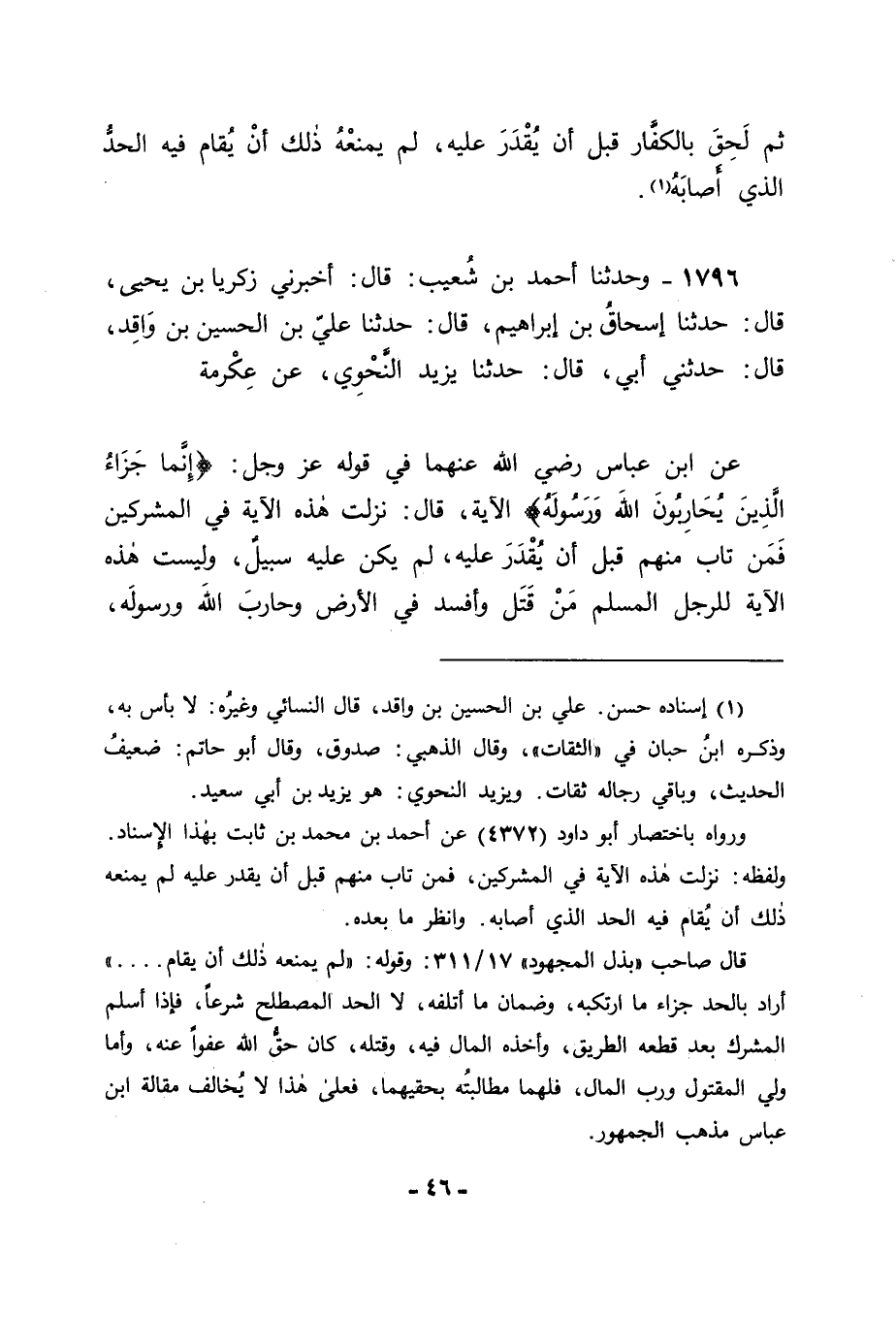 1796 - وَحَدَّثَنَا أَحْمَدُ بْنُ شُعَيْبٍ قَالَ: أَخْبَرَنِي زَكَرِيَّا بْنُ يَحْيَى قَالَ: حَدَّثَنَا إِسْحَاقُ بْنُ إِبْرَاهِيمَ قَالَ: حَدَّثَنَا عَلِيُّ بْنُ الْحُسَيْنِ بْنِ وَاقِدٍ قَالَ: حَدَّثَنِي أَبِي قَالَ: حَدَّثَنَا يَزِيدُ النَّحْوِيُّ , عَنْ عِكْرِمَةَ , عَنِ ابْنِ عَبَّاسٍ رَضِيَ اللهُ عَنْهُمَا فِي قَوْلِهِ عَزَّ وَجَلَّ: {إِنَّمَا جَزَاءُ الَّذِينَ يُحَارِبُونَ اللهَ وَرَسُولَهُ} [المائدة: 33] الْآيَةَ , قَالَ: نَزَلَتْ هَذِهِ الْآيَةُ فِي الْمُشْرِكِينَ , فَمَنْ تَابَ مِنْهُمْ قَبْلَ أَنْ يُقْدَرَ عَلَيْهِ لَمْ يَكُنْ عَلَيْهِ سَبِيلٌ , وَلَيْسَتْ هَذِهِ الْآيَةُ لِلرَّجُلِ الْمُسْلِمِ مَنْ قَتَلَ وَأَفْسَدَ فِي الْأَرْضِ , وَحَارَبَ اللهَ وَرَسُولَهُ , -[47]- ثُمَّ لَحِقَ بِالْكُفَّارِ قَبْلَ أَنْ يُقْدَرَ عَلَيْهِ , لَمْ يَمْنَعْهُ ذَلِكَ أَنْ يُقَامَ فِيهِ الْحَدُّ الَّذِي أَصَابَ