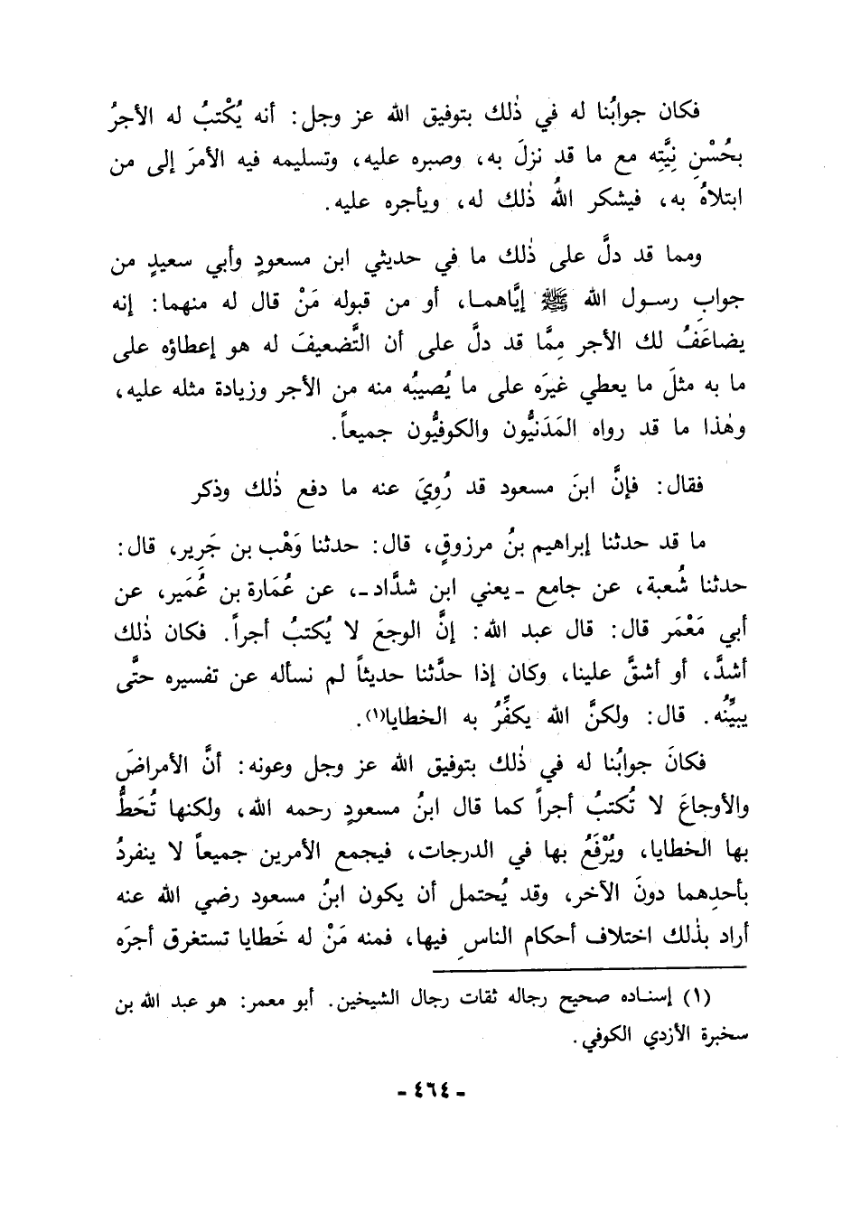 وَذَكَرَ مَا قَدْ حَدَّثَنَا إِبْرَاهِيمُ بْنُ مَرْزُوقٍ قَالَ: حَدَّثَنَا وَهْبُ بْنُ جَرِيرٍ قَالَ: حَدَّثَنَا شُعْبَةُ , عَنْ جَامِعٍ يَعْنِي ابْنَ شَدَّادٍ , عَنْ عُمَارَةَ بْنِ عُمَيْرٍ , عَنْ أَبِي مَعْمَرٍ قَالَ: قَالَ: عَبْدُ اللهِ: " إِنَّ الْوَجَعَ لَا يُكْتَبُ أَجْرًا. فَكَانَ ذَلِكَ أَشَدَّ , أَوْ أَشَقَّ عَلَيْنَا , وَكَانَ إِذَا حَدَّثَنَا حَدِيثًا لَمْ نَسْأَلْهُ عَنْ تَفْسِيرِهِ حَتَّى يُبَيِّنَهُ. قَالَ: وَلَكِنَّ اللهَ يُكَفِّرُ بِهِ الْخَطَايَا ". فَكَانَ جَوَابَنَا لَهُ فِي ذَلِكَ بِتَوْفِيقِ اللهِ عَزَّ وَجَلَّ وَعَوْنِهِ: أَنَّ الْأَمْرَاضَ وَالْأَوْجَاعَ لَا تُكْتَبُ أَجْرًا كَمَا قَالَ ابْنُ مَسْعُودٍ رَحِمَهُ اللهُ , وَلَكِنَّهَا تُحَطُّ بِهَا الْخَطَايَا وَيُرْفَعُ بِهَا فِي الدَّرَجَاتِ , فَيَجْمَعُ الْأَمْرَيْنِ جَمِيعًا لَا يَنْفَرِدُ بِأَحَدِهِمَا دُونَ الْآخَرِ , وَقَدْ يُحْتَمَلُ أَنْ يَكُونَ ابْنُ مَسْعُودٍ رَضِيَ اللهُ عَنْهُ أَرَادَ بِذَلِكَ اخْتِلَافَ أَحْكَامِ النَّاسِ فِيهَا , فَمِنْهُ مَنْ لَهُ خَطَايَا تَسْتَغْرِقُ أَجْرَهُ -[465]- عَلَيْهَا فَيَكُونَ ثَوَابُهُ عَلَيْهَا وَأَجْرُهُ فِيهَا حَطَّ خَطَايَاهُ لَا مَا سِوَاهَا , وَيَكُونَ مَنْ سِوَاهُ مِمَّنْ لَا خَطَايَا لَهُ كَالْأَنْبِيَاءِ صَلَوَاتُ اللهِ عَلَيْهِمْ , أَوْ كَمَنْ سِوَاهُمْ مِمَّنْ يَتَجَاوَزُ أَجْرُهُ حَطِيطَةَ خَطَايَاهُ , فَيُكْتَبُ لَهُ مِنَ الْأَجْرِ مَا لَا يُوجَدُ لَهُ مِنَ الْخَطَايَا مَا يَكُونُ مَا يَكْتُبُ لَهُ كَفَّارَةً لَهَا , وَقَدْ كَانَ يَنْبَغِي أَنْ يَكُونَ لِهَذَا الَّذِي أَنْكَرَ مِنْ هَذَا مَا أَنْكَرَهُ مِمَّا فِي هَذِهِ الْآثَارِ أَنْ لَا يُنْكِرَهُ إِذْ كَانَ قَدْ وَجَدَ الْمُسْلِمِينَ جَمِيعًا يُعَزِّي بَعْضُهُمْ بَعْضًا عَلَى مَصَائِبِهِمْ بِأَوْلِيَائِهِمْ بِأَنْ يُعَظِّمَ اللهُ أُجُورَهُمْ عَلَى ذَلِكَ , وَذَلِكَ مِمَّا لَا فِعْلَ لَهُمْ فِيهِ , وَلَكِنَّ لَهُمْ فِيهِ الصَّبْرَ وَالِاحْتِسَابَ. فَمِثْلُ ذَلِكَ لَهُمْ فِي الْأَمْرَاضِ وَالْأَوْجَاعِ.