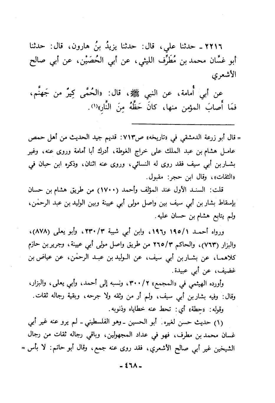 2216 - حَدَّثَنَا عَلِيٌّ قَالَ: حَدَّثَنَا يَزِيدُ بْنُ هَارُونَ قَالَ: حَدَّثَنَا أَبُو غَسَّانَ مُحَمَّدُ بْنُ مُطَرِّفٍ اللَّيْثِيُّ , عَنْ أَبِي الْحُصَيْنِ , عَنْ أَبِي صَالِحٍ الْأَشْعَرِيِّ , عَنْ أَبِي أُمَامَةَ , عَنِ النَّبِيِّ صَلَّى اللَّهُ عَلَيْهِ وَسَلَّمَ قَالَ: " الْحُمَّى كِيرٌ مِنْ جَهَنَّمَ , فَمَا أَصَابَ الْمُؤْمِنَ مِنْهَا كَانَ حَظَّهُ مِنَ النَّارِ "