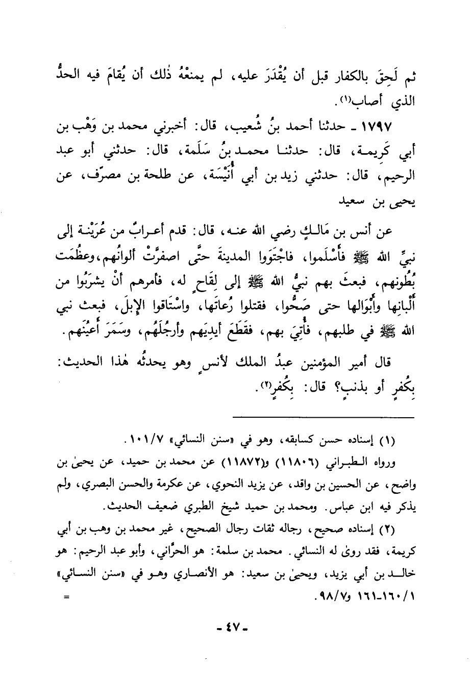 1797 - حَدَّثَنَا أَحْمَدُ بْنُ شُعَيْبٍ قَالَ: أَخْبَرَنِي مُحَمَّدُ بْنُ وَهْبِ بْنِ أَبِي كَرِيمَةَ قَالَ: حَدَّثَنَا مُحَمَّدُ بْنُ سَلَمَةَ قَالَ: حَدَّثَنِي أَبُو عَبْدِ الرَّحِيمِ قَالَ: حَدَّثَنِي زَيْدُ بْنُ أَبِي أُنَيْسَةَ , عَنْ طَلْحَةَ بْنِ مُصَرِّفٍ , عَنْ يَحْيَى بْنِ سَعِيدٍ , عَنْ أَنَسِ بْنِ مَالِكٍ رَضِيَ اللهُ عَنْهُ قَالَ: قَدِمَ أَعْرَابٌ مِنْ عُرَيْنَةَ إِلَى نَبِيِّ اللهِ صَلَّى اللَّهُ عَلَيْهِ وَسَلَّمَ فَأَسْلَمُوا فَاجْتَوَوَا الْمَدِينَةَ حَتَّى اصْفَرَّتْ أَلْوَانُهُمْ , وَعَظُمَتْ بُطُونُهُمْ , فَبَعَثَ بِهِمْ نَبِيُّ اللهِ صَلَّى اللَّهُ عَلَيْهِ وَسَلَّمَ إِلَى لِقَاحٍ لَهُ , فَأَمَرَهُمْ أَنْ يَشْرَبُوا مِنْ أَلْبَانِهَا وَأَبْوَالِهَا حَتَّى صَحُّوا , فَقَتَلُوا رُعَاتَهَا وَاسْتَاقُوا الْإِبِلَ , فَبَعَثَ نَبِيُّ اللهِ صَلَّى اللَّهُ عَلَيْهِ وَسَلَّمَ فِي طَلَبِهِمْ , فَأُتِيَ بِهِمْ , فَقَطَعَ أَيْدِيَهُمْ وَأَرْجُلَهُمْ , وَسَمَرَ أَعْيُنَهُمْ. قَالَ أَمِيرُ الْمُؤْمِنِينَ عَبْدُ الْمَلِكِ لِأَنَسٍ وَهُوَ يُحَدِّثُهُ هَذَا الْحَدِيثَ: بِكُفْرٍ أَوْ بِذَنْبٍ؟ قَالَ: بِكُفْرٍ. -[48]- فَفِي الْحَدِيثِ الْأَوَّلِ مِنْ هَذَيْنِ الْحَدِيثَيْنِ أَنَّ الْحُكْمَ الْمَذْكُورَ فِيهِ فِي الْمُشْرِكِينَ إِذَا فَعَلُوا هَذِهِ الْأَفْعَالَ لَا فِيمَنْ سِوَاهُمْ مِمَّنْ هُوَ مُتَمَسِّكٌ بِالْإِسْلَامِ , وَفِي الْحَدِيثِ الثَّانِي مِنْهُمَا مَا قَدْ دَلَّ عَلَى أَنَّ الْعُقُوبَةَ فِي ذَلِكَ كَانَتْ عَنْدَ أَنَسِ بْنِ مَالِكٍ إِذْ كَانَتْ تِلْكَ الْأَفْعَالُ مَعَ الزِّيَادَةِ لَا مَعَ الْإِسْلَامِ. وَلَمَّا اخْتَلَفُوا فِي ذَلِكَ هَذَا الِاخْتِلَافَ طَلَبْنَا الْوَجْهَ فِيهِ , وَوَجَدْنَا اللهَ قَدْ قَالَ فِي كِتَابِهِ: {إِنَّمَا جَزَاءُ الَّذِينَ يُحَارِبُونَ اللهَ وَرَسُولَهُ وَيَسْعَوْنَ فِي الْأَرْضِ فَسَادًا أَنْ يُقَتَّلُوا أَوْ يُصَلَّبُوا أَوْ تُقَطَّعَ أَيْدِيهِمْ وَأَرْجُلُهُمْ مِنْ خِلَافٍ أَوْ يُنْفَوْا مِنَ الْأَرْضِ ذَلِكَ لَهُمْ خِزْيٌ فِي الدُّنْيَا} [المائدة: 33] الْآيَةَ , فَكَانَ مَا ذَكَرَ اللهُ فِي هَذِهِ الْآيَةِ قَدْ ذَكَرَ فِيهِ أَنَّ الْعُقُوبَاتِ الْمَذْكُورَاتِ فِيهَا جَزَاءٌ لِمَنْ أَصَابَ تِلْكَ الْأَشْيَاءَ الَّتِي تِلْكَ الْعُقُوبَاتُ عُقُوبَاتٌ لَهَا , وَقَدْ تَكُونُ تِلْكَ الْأَشْيَاءُ مِمَّنْ يَنْتَحِلُ الْإِسْلَامَ وَمِمَّنْ سِوَاهُمْ , وَكَانَتِ الْمُحَارَبَةُ هِيَ الْعَدَاوَةَ لِلَّهِ عَزَّ وَجَلَّ بِالْأَفْعَالِ الَّتِي لَا يَرْضَاهَا