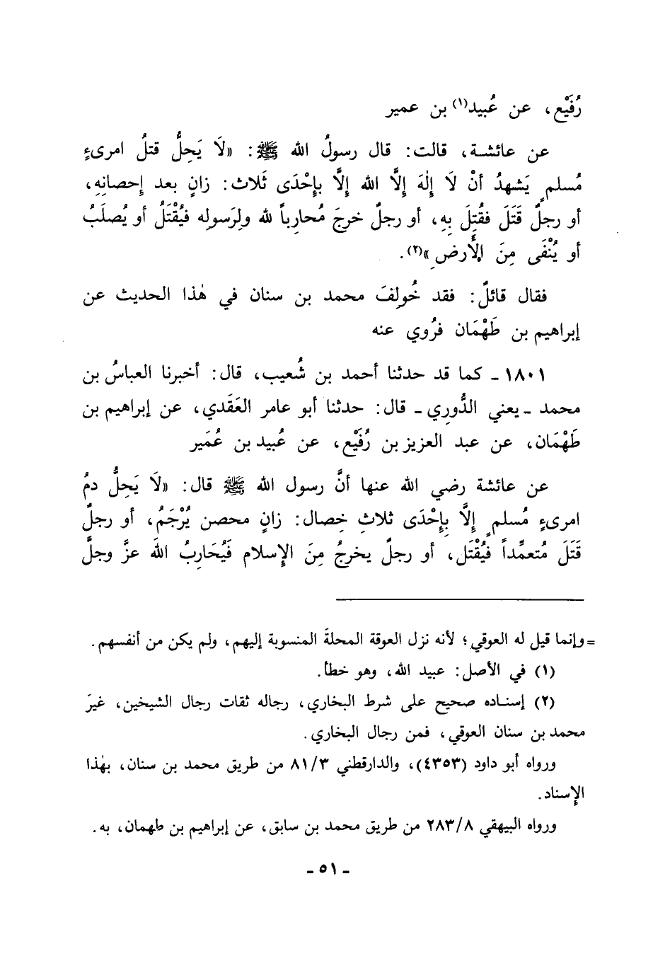 1801 - كَمَا قَدْ حَدَّثَنَا أَحْمَدُ بْنُ شُعَيْبٍ قَالَ: أَخْبَرَنَا الْعَبَّاسُ بْنُ مُحَمَّدٍ يَعَنْي الدَّوْرِيَّ قَالَ: حَدَّثَنَا أَبُو عَامِرٍ الْعَقَدِيُّ , عَنْ إِبْرَاهِيمَ بْنِ طَهْمَانَ , عَنْ عَبْدِ الْعَزِيزِ بْنِ رُفَيْعٍ , عَنْ عُبَيْدِ بْنِ عُمَيْرٍ , عَنْ عَائِشَةَ رَضِيَ اللهُ عَنْهَا , أَنَّ رَسُولَ اللهِ صَلَّى اللَّهُ عَلَيْهِ وَسَلَّمَ قَالَ: " لَا يَحِلُّ دَمُ امْرِئٍ مُسْلِمٍ إِلَّا بِإِحْدَى ثَلَاثِ خِصَالٍ: زَانٍ مُحْصَنٌ يُرْجَمُ , أَوْ رَجُلٌ قَتَلَ مُتَعَمِّدًا فَيُقْتَلُ , أَوْ رَجُلٌ يَخْرُجُ مِنَ الْإِسْلَامِ فَيُحَارِبُ اللهَ عَزَّ وَجَلَّ -[52]- وَرَسُولَهُ صَلَّى اللَّهُ عَلَيْهِ وَسَلَّمَ فَيُقْتَلُ , أَوْ يُصْلَبُ , أَوْ يُنْفَى مِنَ الْأَرْضِ ". قَالَ أَبُو جَعْفَرٍ: فَكَانَ جَوَابَنَا لَهُ: أَنَّ قَوْلَهُ صَلَّى اللَّهُ عَلَيْهِ وَسَلَّمَ: " أَوْ رَجُلٌ يَخْرُجُ مِنَ الْإِسْلَامِ " بَعْدَ قَوْلِهِ: " لَا يَحِلُّ دَمُ امْرِئٍ مُسْلِمٍ إِلَّا بِإِحْدَى ثَلَاثِ خِصَالٍ " فَيُثْبِتُ الْإِسْلَامَ لِأَهْلِهَا , ثُمَّ ذِكْرُ هَذِهِ الْحَوَادِثِ مِنْهُمْ دَلِيلٌ عَلَى أَنَّهُ أَرَادَ مَنْ لَهُ فِي الْإِسْلَامِ نَصِيبٌ إِذَا فَعَلَ هَذِهِ الْأَفْعَالَ , وَكَانَ قَوْلُهُ: " يَخْرُجُ مِنَ الْإِسْلَامِ " مِمَّا قَدْ يُحْتَمَلُ أَنْ يَكُونَ أَرَادَ بِهِ يَخْرُجُ عَنْ جُمْلَةِ أَهْلِ الْإِسْلَامِ إِلَى الْخُرُوجِ عَلَيْهِمْ بِسَيْفِهِ , فَيَكُونُ ذَلِكَ مُوَافِقًا لِمَا رَوَى مُحَمَّدُ بْنُ سِنَانٍ هَذَا الْحَدِيثَ , عَنْ إِبْرَاهِيمَ بْنِ طَهْمَانَ عَلَيْهِ , وَلَوْلَا ذَلِكَ لَمَا كَانَ لِذِكْرِ الْإِسْلَامِ فِي أَوَّلِهِ مَعْنًى , إِذْ كَانَتْ هَذِهِ الْأَفْعَالُ لَوْ كَانَتْ مِنْ غَيْرِ أَهْلِ الْإِسْلَامِ لَاسْتَحَقُّوا هَذِهِ الْعُقُوبَةَ فِي قَوْلِ أَهْلِ الْعِلْمِ جَمِيعًا , وَلَكِنَّ ذِكْرَ الْإِسْلَامِ يُوجِبُ أَنْ يَكُونَ أَهْلُ هَذِهِ الْأَفْعَالِ الثَّلَاثَةِ مِنْ أَهْلِ الْإِسْلَامِ خَارِجِينَ عَنْ أَخْلَاقِ أَهْلِهِ إِلَى تِلْكَ الْأَفْعَالِ الْمَذْمُومَةِ , وَنَعُوذُ بِاللهِ مِنْهَا. -[53]- فَقَالَ قَائِلٌ: فَقَدِ احْتَجَجْتَ بِحَدِيثِ إِبْرَاهِيمَ بْنِ طَهْمَانَ هَذَا , وَفِيهِ تَخَيُّرُ الْإِمَامِ فِي هَذِهِ الْأَشْيَاءِ , أَيَّهَا رَأَى أَنْ يُقِيمَهُ عَلَى أَهْلِ الْمُحَارَبَةِ , وَأَنْتَ لَا تَقُولُ هَذَا , وَقَدْ قَالَ بِالتَّخَيُّرِ قَبْلَكَ فِي هَذِهِ الْعُقُوبَةِ غَيْرُ وَاحِدٍ مِنْ أَهْلِ الْعِلْمِ؟