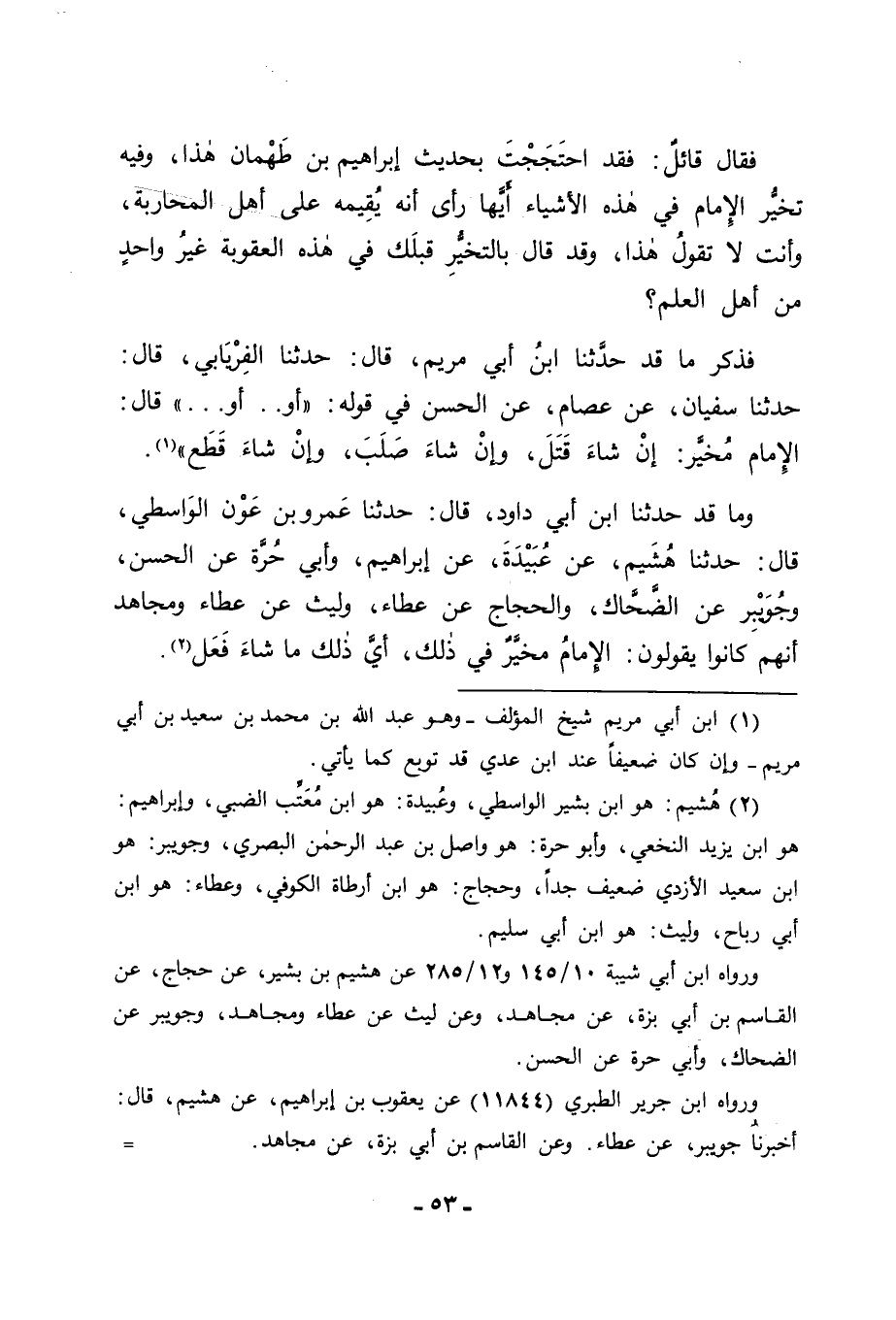 وَمَا قَدْ حَدَّثَنَا ابْنُ أَبِي دَاوُدَ قَالَ: حَدَّثَنَا عَمْرُو بْنُ عَوْنٍ الْوَاسِطِيُّ قَالَ: حَدَّثَنَا هُشَيْمٌ , عَنْ عُبَيْدَةَ , عَنْ إِبْرَاهِيمَ , وَأَبِي حَرَّةَ عَنِ الْحَسَنِ وَجُوَيْبِرٍ عَنِ الضَّحَّاكِ وَالْحَجَّاجِ , عَنْ عَطَاءٍ وَلَيْثٍ , عَنْ عَطَاءٍ وَمُجَاهِدٍ أَنَّهُمْ كَانُوا يَقُولُونَ: " الْإِمَامُ مُخَيَّرٌ فِي ذَلِكَ , أَيَّ ذَلِكَ مَا شَاءَ فَعَلَ " -[54]- وَمَا قَدْ حَدَّثَنَا أَحْمَدُ بْنُ أَبِي دَاوُدَ قَالَ حَدَّثَنَا مُحَمَّدُ بْنُ عَوْنٍ الزِّيَادِيُّ , عَنْ حَمَّادٍ , عَنْ عِمْرَانَ بْنِ حُدَيْرٍ , عَنْ أَبِي مِجْلَزٍ