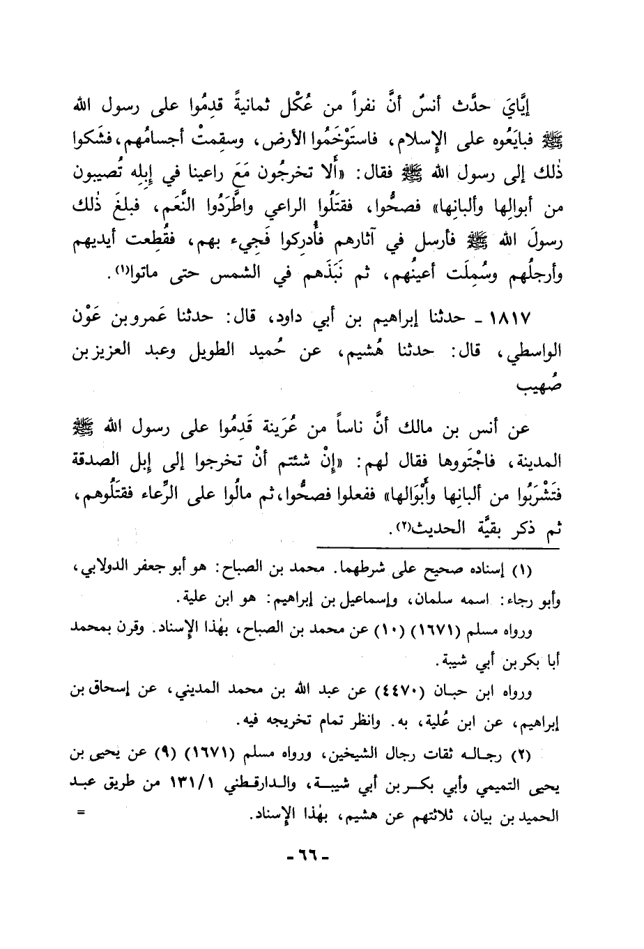 1817 - حَدَّثَنَا إِبْرَاهِيمُ بْنُ أَبِي دَاوُدَ قَالَ: حَدَّثَنَا عَمْرُو بْنُ عَوْنٍ الْوَاسِطِيُّ قَالَ: حَدَّثَنَا هُشَيْمٌ , عَنْ حُمَيْدٍ الطَّوِيلِ , وَعَبْدِ الْعَزِيزِ بْنِ صُهَيْبٍ , عَنْ أَنَسِ بْنِ مَالِكٍ , أَنَّ نَاسًا مِنْ عُرَيْنَةَ قَدِمُوا عَلَى رَسُولِ اللهِ صَلَّى اللَّهُ عَلَيْهِ وَسَلَّمَ الْمَدِينَةَ فَاجْتَوَوْهَا , فَقَالَ لَهُمْ: " إِنْ شِئْتُمْ أَنْ تَخْرُجُوا إِلَى إِبِلِ الصَّدَقَةِ فَتَشْرَبُوا مِنْ أَلْبَانِهَا وَأَبْوَالِهَا " فَفَعَلُوا فَصَحُّوا , ثُمَّ مَالُوا عَلَى الرُّعَاةِ فَقَتَلُوهُمْ ثُمَّ ذَكَرَ بَقِيَّةَ الْحَدِيثِ