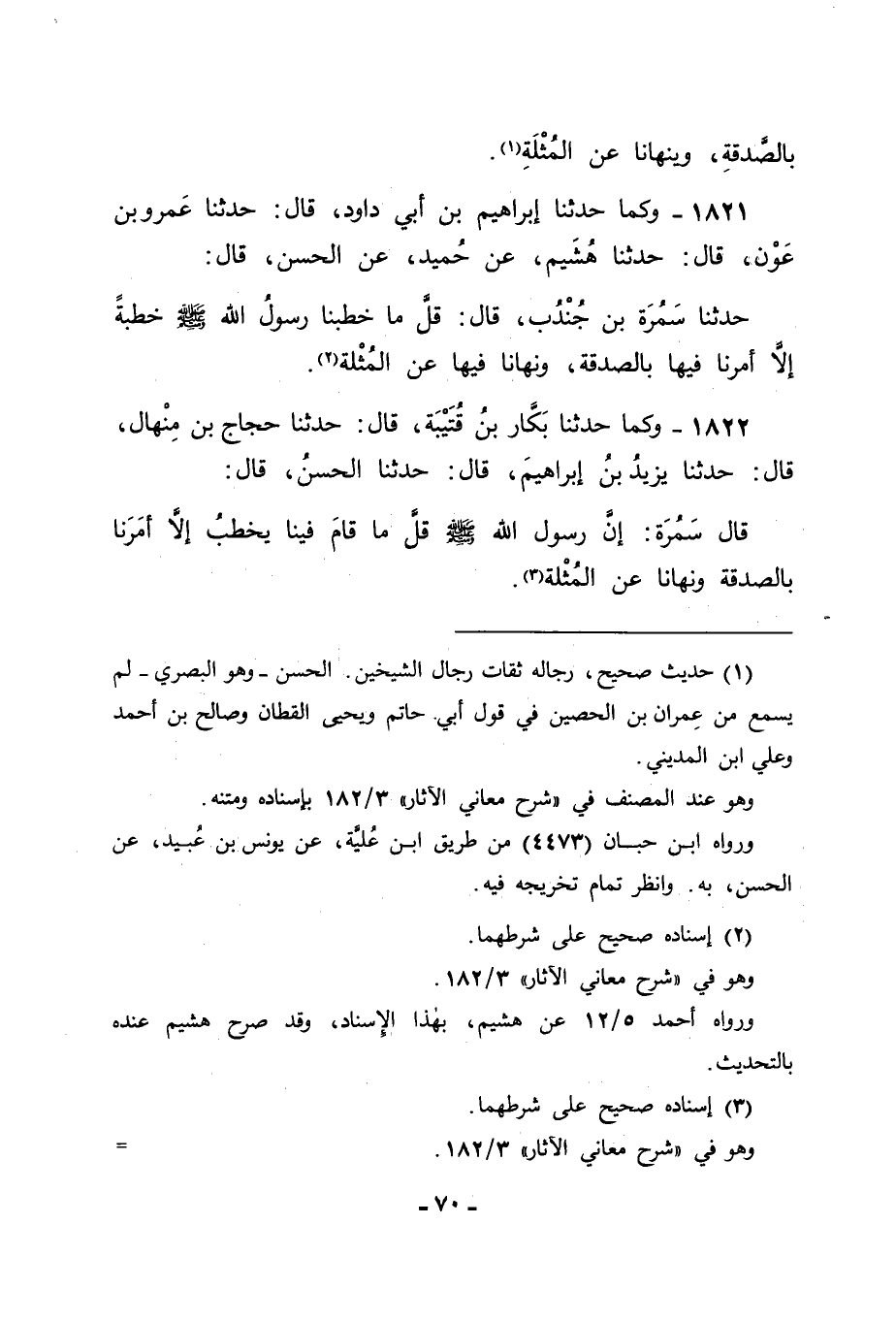 1822 - وَكَمَا حَدَّثَنَا بَكَّارُ بْنُ قُتَيْبَةَ قَالَ: حَدَّثَنَا حَجَّاجُ بْنُ مِنْهَالٍ قَالَ: حَدَّثَنَا يَزِيدُ بْنُ إِبْرَاهِيمَ قَالَ: حَدَّثَنَا الْحَسَنُ قَالَ: قَالَ سَمُرَةُ: إِنَّ رَسُولَ اللهِ صَلَّى اللَّهُ عَلَيْهِ وَسَلَّمَ قَلَّ مَا قَامَ فِينَا يَخْطُبُ إِلَّا أَمَرَنَا بِالصَّدَقَةِ , وَنَهَانَا عَنِ الْمُثْلَةِ -[71]- قَالَ أَبُو جَعْفَرٍ: فَكَانَ ذَلِكَ نَسْخًا لِلْمُثْلَةِ , وَعَادَ الْقَتْلُ الْوَاجِبُ بِمِثْلِ مَا كَانَ مِنْ أُولَئِكَ الْقَوْمِ مُبَاحًا اسْتِعْمَالُهُ بِالْآيَةِ الَّتِي أُنْزِلَتْ فِيهِمْ مَنْسُوخًا مِنْهُ الْمُثْلَةُ الْمُسْتَعْمَلَةُ كَانَتْ فِي ذَلِكَ , وَقَدْ رَوَى بَعْضُ النَّاسِ حَدِيثًا فِيهِ مِنْ كَلَامِ أَنَسِ بْنِ مَالِكٍ حَرْفٌ زَائِدٌ عَلَى جَمِيعِ مَا فِي هَذِهِ الْأَحَادِيثِ الَّتِي قَدْ رَوَيْنَاهَا فِي هَذَا الْبَابِ وَهُوَ