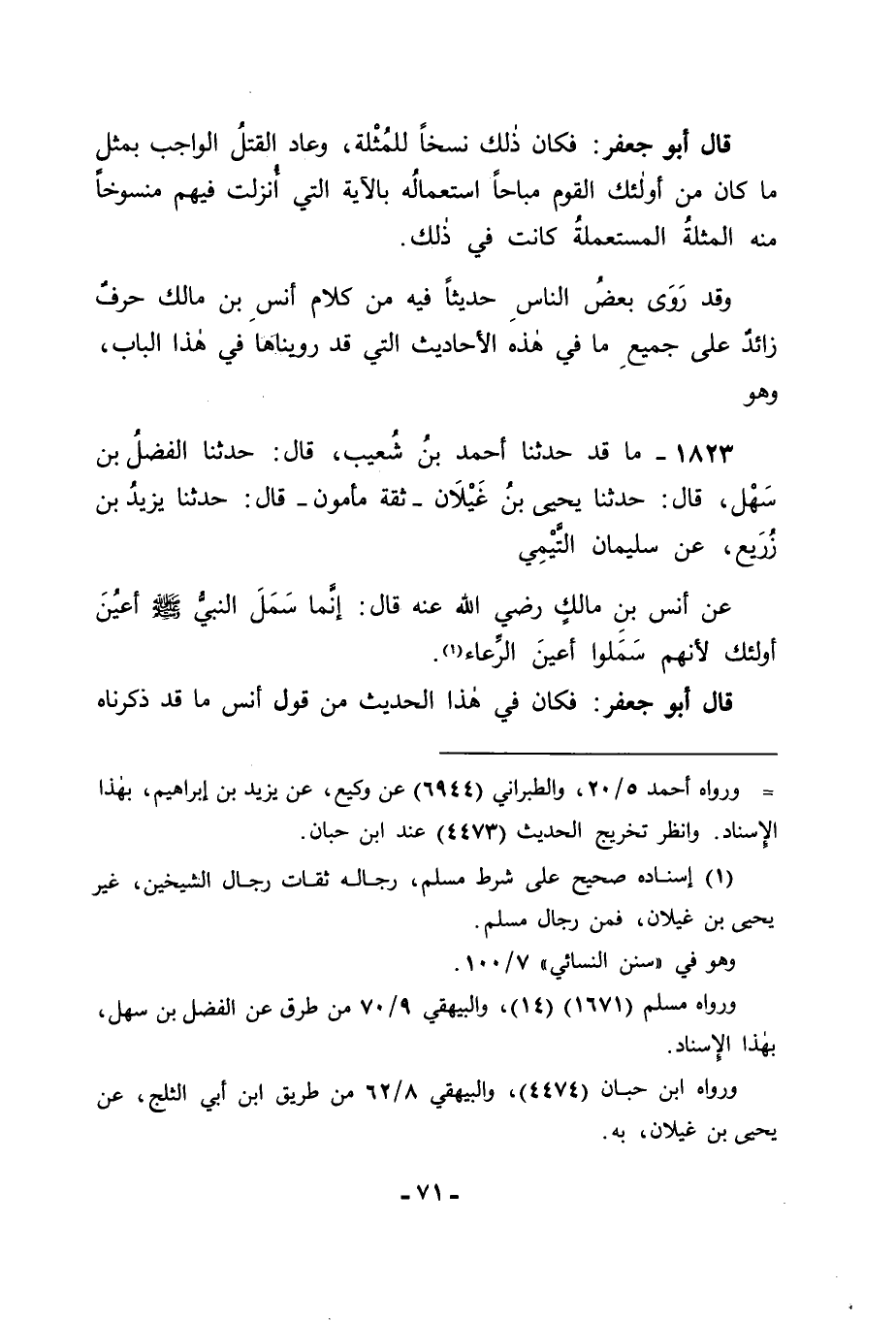 1823 - مَا قَدْ حَدَّثَنَا أَحْمَدُ بْنُ شُعَيْبٍ قَالَ: حَدَّثَنَا الْفَضْلُ بْنُ سَهْلٍ قَالَ: حَدَّثَنَا يَحْيَى بْنُ غَيْلَانَ , ثِقَةٌ مَأْمُونٌ , قَالَ: حَدَّثَنَا يَزِيدُ بْنُ زُرَيْعٍ , عَنْ سُلَيْمَانَ التَّيْمِيِّ , عَنْ أَنَسِ بْنِ مَالِكٍ رَضِيَ اللهُ عَنْهُ قَالَ: إِنَّمَا سَمَلَ النَّبِيُّ صَلَّى اللَّهُ عَلَيْهِ وَسَلَّمَ أَعْيُنَ أُولَئِكَ لِأَنَّهُمْ سَمَلُوا أَعْيُنَ الرِّعَاءِ. قَالَ أَبُو جَعْفَرٍ فَكَانَ فِي هَذَا الْحَدِيثِ مِنْ قَوْلِ أَنَسٍ مَا قَدْ ذَكَرْنَاهُ -[72]- فِيهِ عَنْهُ , وَهَذَا الْحَدِيثُ عَنْدَنَا مُنْكَرٌ؛ لِأَنَّ فِيمَا قَدْ تَقَدَّمَتْ رِوَايَتُنَا لَهُ فِي هَذَا الْبَابِ أَنَّ أَحَدَ رَاعِيَيْ النَّبِيِّ صَلَّى اللَّهُ عَلَيْهِ وَسَلَّمَ الَّذِي كَانَ فِي تِلْكَ الْإِبِلِ لَمَّا جَاءَهُ قَالَ: قَدْ قَتَلُوا صَاحِبِي , وَفِي ذَلِكَ مَا يَنْفِي أَنْ يَكُونَ كَانَ مَسْمُولَ الْعَيْنِ , وَلَا اخْتِلَافَ بَيْنَ أَهْلِ الْعِلْمِ فِيمَا يُقَامُ عَلَى مَنْ كَانَ مِنْهُ مِثْلُ الَّذِي كَانَ مِنْ أُولَئِكَ الْقَوْمِ أَنَّهُ حَدُّ لِلَّهِ عَزَّ وَجَلَّ لِلْمُحَارَبَةِ الَّتِي كَانَتْ لَا حَقٌّ لِلَّذِينَ حُورِبُوا بِهَا , وَأَنَّ الَّذِينَ حُورِبُوا بِهَا لَوْ عَفَا أَوْلِيَاؤُهُمْ عَمَّا كَانَ أَتَى إِلَى أَصْحَابِهِمْ أَنَّ عَفْوَهُمْ بَاطِلٌ. وَفِي ذَلِكَ مَا يَدُلُّ أَنَّ النَّبِيَّ صَلَّى اللَّهُ عَلَيْهِ وَسَلَّمَ لَمْ يَكُنْ فَعَلَ فِي أُولَئِكَ الْقَوْمِ مَا قَدْ فَعَلَ قِصَاصًا بِمَا فَعَلُوا , وَأَنَّهُ إِنَّمَا كَانَ فَعَلَهُ بِهِمْ لِمَا أَوْجَبَتْهُ عَلَيْهِمُ الْمُحَارَبَةُ لَا لِمَا سِوَاهُ , وَلَا اخْتِلَافَ بَيْنَ أَهْلِ الْعِلْمِ عَلِمْنَاهُ فِي الْمُحَارِبِينَ: لَوْ قَطَعُوا الْآذَانَ , وَالْأَيْدِيَ وَالْأَرْجُلَ , حَتَّى لَمْ يُبْقُوا لِمَنْ حَارَبَ أُذُنًا , وَلَا يَدًا , وَلَا رِجْلًا , أَنَّهُ لَا يُفْعَلُ بِهِمْ مِثْلُ ذَلِكَ , وَأَنَّهُ يُقْتَصَرُ بِهِمْ عَلَى مَا فِي الْآيَةِ الَّتِي أَنْزَلَهَا اللهُ فِي الْمُحَارَبَةِ الَّتِي قَدْ تَقَدَّمَتْ تِلَاوَتُنَا لَهَا فِي هَذَا الْبَابِ , وَفِيمَا ذَكَرْنَا مِنْ ذَلِكَ مَا قَدْ دَلَّ عَلَى فَسَادِ هَذَا الْحَدِيثِ الَّذِي رَوَيْنَا وَبِاللهِ التَّوْفِيقُ