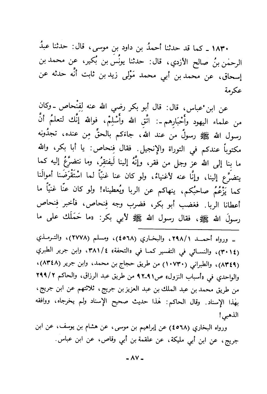 1830 - كَمَا قَدْ حَدَّثَنَا أَحْمَدُ بْنُ دَاوُدَ بْنِ مُوسَى قَالَ: حَدَّثَنَا عَبْدُ الرَّحْمَنِ بْنُ صَالِحٍ الْأَزْدِيُّ قَالَ: حَدَّثَنَا يُونُسُ بْنُ بُكَيْرٍ , عَنْ مُحَمَّدِ بْنِ إِسْحَاقَ , عَنْ مُحَمَّدِ بْنِ أَبِي مُحَمَّدٍ , مَوْلَى زَيْدِ بْنِ ثَابِتٍ , أَنَّهُ حَدَّثَهُ , عَنْ عِكْرِمَةَ , عَنِ ابْنِ عَبَّاسٍ قَالَ: قَالَ أَبُو بَكْرٍ رَضِيَ اللهُ عَنْهُ لِفِنْحَاصَ , وَكَانَ مِنْ عُلَمَاءِ الْيَهُودِ وَأَحْبَارِهِمْ: اتَّقِ اللهَ وَأَسْلِمْ , فَوَاللهِ إِنَّكَ لَتَعْلَمُ أَنَّ رَسُولَ اللهِ صَلَّى اللَّهُ عَلَيْهِ وَسَلَّمَ مِنْ عِنْدِ اللهِ , جَاءَكُمْ بِالْحَقِّ مِنْ عِنْدِهِ , تَجِدُونَهُ مَكْتُوبًا عَنْدَكُمْ فِي التَّوْرَاةِ وَالْإِنْجِيلِ , فَقَالَ فِنْحَاصُ: يَا أَبَا بَكْرٍ , وَاللهِ مَا بِنَا إِلَى اللهِ عَزَّ وَجَلَّ مِنْ فَقْرٍ , وَإِنَّهُ إِلَيْنَا لَيَفْتَقِرُ , وَمَا نَتَضَرَّعُ إِلَيْهِ كَمَا يَتَضَرَّعُ إِلَيْنَا , وَإِنَّا عَنْهُ لَأَغْنِيَاءُ , وَلَوْ كَانَ عَنَّا غَنِيًّا لَمَا اسْتَقْرَضَنَا أَمْوَالَنَا كَمَا يَزْعُمُ صَاحِبُكُمْ , يَنْهَاكُمْ عَنِ الرِّبَا وَيُعْطِينَاهُ , وَلَوْ كَانَ عَنَّا غَنِيًّا مَا أَعْطَانَا الرِّبَا , فَغَضِبَ أَبُو بَكْرٍ فَضَرَبَ وَجْهَ فِنْحَاصَ , فَأَخْبَرَ فِنْحَاصُ رَسُولَ اللهِ صَلَّى اللَّهُ عَلَيْهِ وَسَلَّمَ , فَقَالَ رَسُولُ اللهِ صَلَّى اللَّهُ عَلَيْهِ وَسَلَّمَ لِأَبِي بَكْرٍ: " مَا حَمَلَكَ عَلَى مَا -[88]- صَنَعْتَ؟ " فَأَخْبَرَهُ , فَجَحَدَ ذَلِكَ فِنْحَاصُ وَقَالَ: مَا قُلْتُ ذَلِكَ , فَأَنْزَلَ اللهُ عَزَّ وَجَلَّ: {لَقَدْ سَمِعَ اللهُ قَوْلَ الَّذِينَ قَالُوا إِنَّ اللهَ فَقِيرٌ وَنَحْنُ أَغْنِيَاءُ} [آل عمران: 181] الْآيَةَ , إِلَى قَوْلِهِ عَزَّ وَجَلَّ: {عَذَابَ الْحَرِيقِ} [آل عمران: 181] , وَأَنْزَلَ فِي أَبِي بَكْرٍ رَضِيَ اللهُ عَنْهُ وَمَا بَلَغَهُ مِنْ ذَلِكَ الْغَضَبِ: {وَلَتَسْمَعُنْ مِنَ الَّذِينَ أُوتُوا الْكِتَابَ مِنْ قَبْلِكُمْ وَمِنَ الَّذِينَ أَشْرَكُوا أَذًى كَثِيرًا وَإِنْ تَصْبِرُوا وَتَتَّقُوا فَإِنَّ ذَلِكَ مِنْ عَزْمِ الْأُمُورِ} [آل عمران: 186] وَقَالَ فِي مَا قَالَ فِنْحَاصُ وَأَحْبَارٌ مِنَ الْيَهُودِ مَعَهُ: {وَإِذْ أَخَذَ اللهُ مِيثَاقَ الَّذِينَ أُوتُوا الْكِتَابَ لَتُبَيِّنُنَّهُ لِلنَّاسِ وَلَا تَكْتُمُونَهُ} [آل عمران: 187] إِلَى قَوْلِهِ عَزَّ وَجَلَّ: {عَذَابٌ أَلِيمٌ} [آل عمران: 187] , يَعْنِي فِنْحَاصَ , وَأَشْبَعَ وَأَشْبَاهَهُمَا مِنَ الْأَحْبَارِ الَّذِينَ يَفْرَحُونَ بِمَا يُصِيبُونَ مِنَ الدُّنْيَا عَلَى مَا زَيَّنُوا لِلنَّاسِ مِنَ الضَّلَالَةِ , وَيُحِبُّونَ أَنْ يُحْمَدُوا بِمَا لَمْ يَفْعَلُوا , وَلِيَقُولَ -[89]- النَّاسُ: لَهُمْ عِلْمٌ , وَلَيْسُوا بِأَهْلِ عِلْمٍ , لَمْ يَحْمِلُوهُمْ عَلَى هُدًى وَلَا عَلَى خَيْرٍ , وَيُحِبُّونَ أَنْ يَقُولَ النَّاسُ: قَدْ فَعَلُوا , وَلَمْ يَفْعَلُوا فَقَالَ قَائِلٌ: فِي هَذِهِ الرِّوَايَاتِ تَضَادٌّ شَدِيدٌ؛ لِأَنَّ فِيهَا عَنْ رَافِعِ بْنِ خَدِيجٍ رَضِيَ اللهُ عَنْهُ , وَعَنْ أَبِي سَعِيدٍ الْخُدْرِيِّ أَنَّهَا نَزَلَتْ فِي الْمُنَافِقِينَ الَّذِينَ كَانُوا يَعْتَذِرُونَ إِلَى رَسُولِ اللهِ صَلَّى اللَّهُ عَلَيْهِ وَسَلَّمَ بَعْدَ قُدُومِهِ مِنْ غَزْوِهِ أَنَّهُمْ لَمْ يُخَلِّفْهُمْ عَنْهُ أَنْ يَكُونُوا مَعَهُ فِي غَزْوِهِ إِلَّا السَّقَمُ وَالشُّغْلُ؛ وَلِأَنَّ فِيهَا عَنِ ابْنِ عَبَّاسٍ مَا يُخَالِفُ ذَلِكَ , وَأَنَّ الْمُرَادِينَ بِهَا أَهْلُ الْكِتَابِ الَّذِينَ أَخْبَرُوا رَسُولَ اللهِ صَلَّى اللَّهُ عَلَيْهِ وَسَلَّمَ بِخِلَافِ مَا فِي كِتَابِهِمْ حِينَ سَأَلَهُمْ عَنْهُ فَأَخْبَرُوهُ بِخِلَافِهِ , وَهَذَا تَضَادٌّ شَدِيدٌ. فَكَانَ جَوَا