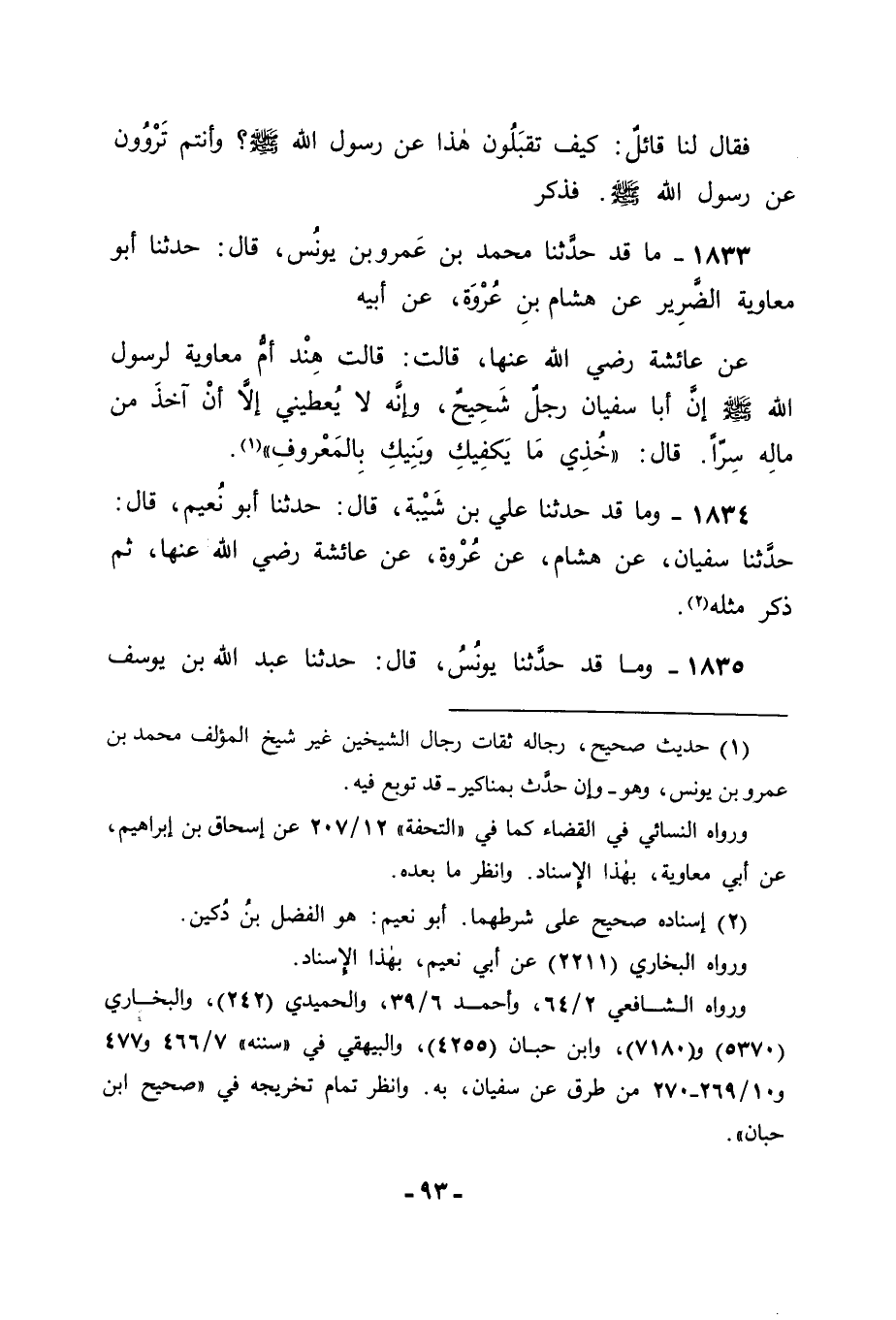 1835 - وَمَا قَدْ حَدَّثَنَا يُونُسُ قَالَ: حَدَّثَنَا عَبْدُ اللهِ بْنُ يُوسُفَ -[94]- الدِّمَشْقِيُّ قَالَ: حَدَّثَنَا اللَّيْثُ بْنُ سَعْدٍ قَالَ: حَدَّثَنِي هِشَامُ بْنُ عُرْوَةَ , عَنْ عُرْوَةَ , عَنْ عَائِشَةَ رَضِيَ اللهُ عَنْهَا حَدَّثَتْهُ: أَنَّ هِنْدَ ابْنَةَ عُتْبَةَ أُمَّ مُعَاوِيَةَ بْنِ أَبِي سُفْيَانَ جَاءَتْ رَسُولَ اللهِ صَلَّى اللَّهُ عَلَيْهِ وَسَلَّمَ فَقَالَتْ: إِنَّ أَبَا سُفْيَانَ رَجُلٌ شَحِيحٌ شَدِيدٌ , وَإِنَّهُ لَا يُعْطِينِي وَوَلَدِي إِلَّا مَا أَخَذْتُ مِنْهُ وَهُوَ لَا يَعْلَمُ , فَهَلْ عَلَيَّ فِي ذَلِكَ مِنْ شَيْءٍ؟ فَقَالَ: " خُذِي مَا يَكْفِيكِ وَبَنِيكِ بِالْمَعْرُوفِ "