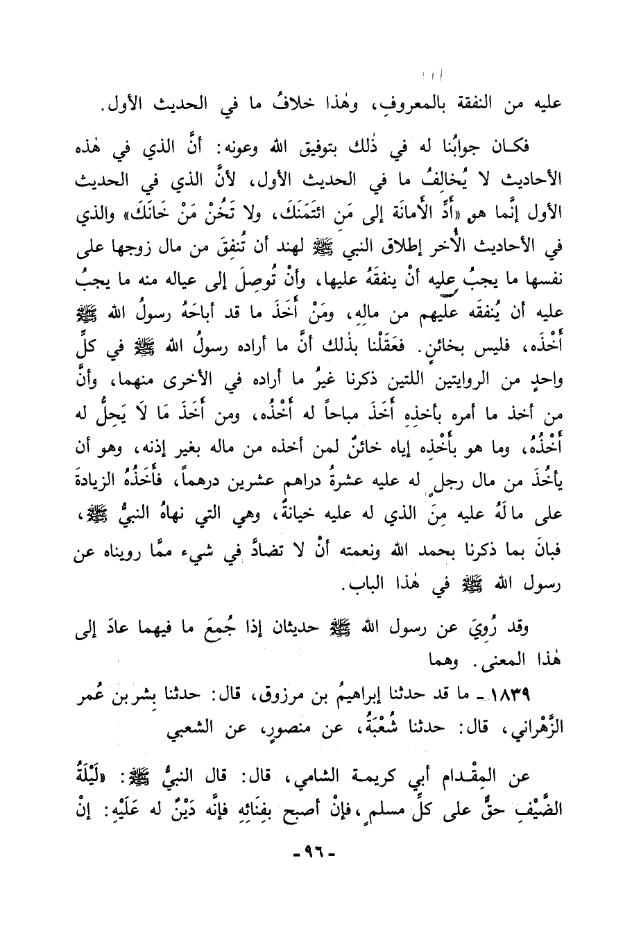 1839 - مَا قَدْ حَدَّثَنَا إِبْرَاهِيمُ بْنُ مَرْزُوقٍ قَالَ: حَدَّثَنَا بِشْرُ بْنُ عُمَرَ الزَّهْرَانِيُّ قَالَ: حَدَّثَنَا شُعْبَةُ , عَنْ مَنْصُورٍ , عَنِ الشَّعْبِيِّ , عَنِ الْمِقْدَامِ أَبِي كَرِيمَةَ الشَّامِيِّ قَالَ: قَالَ النَّبِيُّ صَلَّى اللَّهُ عَلَيْهِ وَسَلَّمَ: " لَيْلَةُ الضَّيْفِ حَقٌّ عَلَى كُلِّ مُسْلِمٍ , فَإِنْ أَصْبَحَ بِفِنَائِهِ فَإِنَّهُ دَيْنٌ لَهُ عَلَيْهِ , إِنْ -[97]- شَاءَ اقْتَضَاهُ , وَإِنْ شَاءَ تَرَكَهُ ". فَكَانَ فِي هَذَا الْحَدِيثِ أَنَّهُ صَلَّى اللَّهُ عَلَيْهِ وَسَلَّمَ جَعَلَ حَقَّ الضَّيْفِ دَيْنًا لِلْمُضَيِّفِ عَلَى الَّذِي نَزَلَ بِهِ