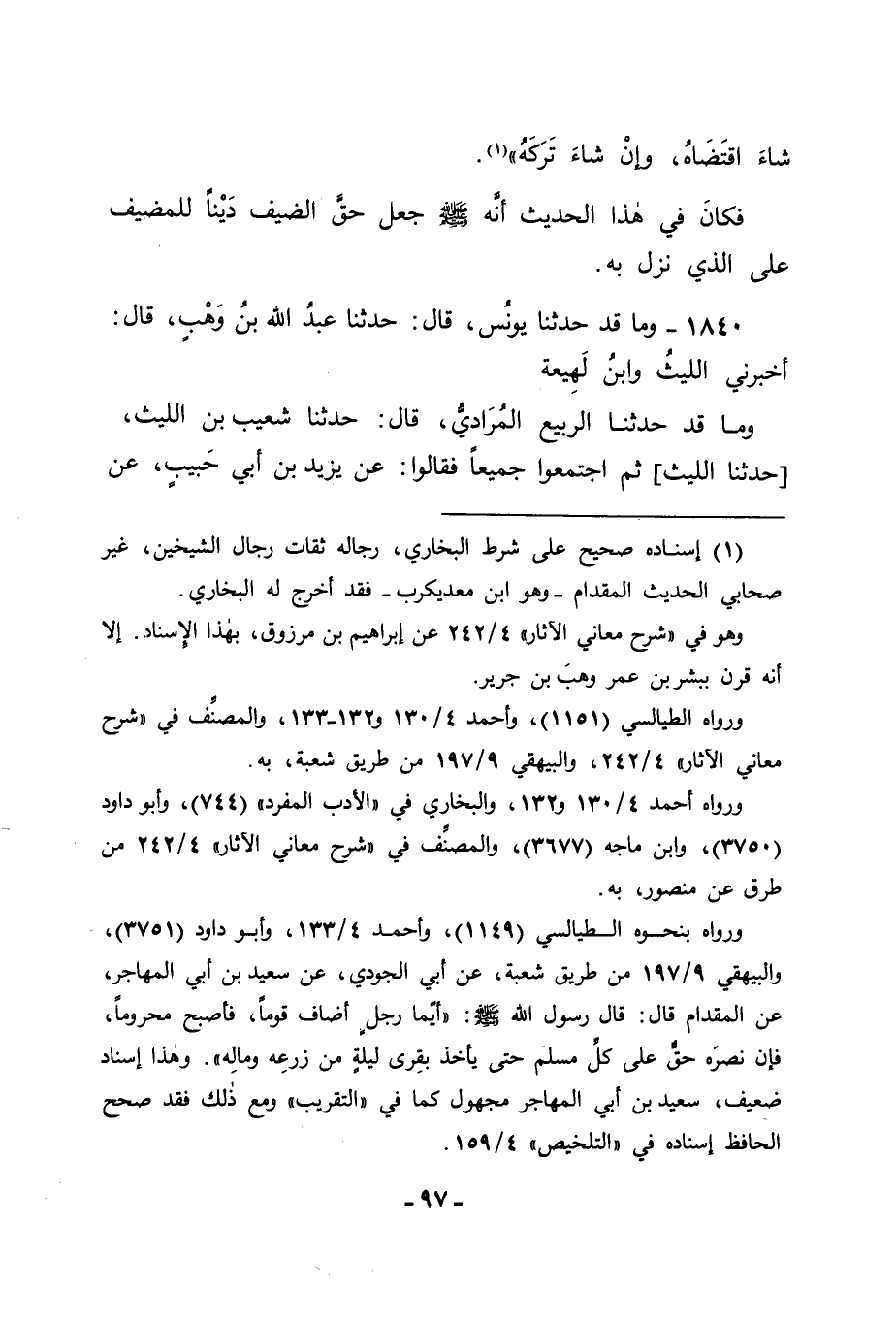 1840 - وَمَا قَدْ حَدَّثَنَا يُونُسُ قَالَ: حَدَّثَنَا عَبْدُ اللهِ بْنُ وَهْبٍ قَالَ: أَخْبَرَنِي اللَّيْثُ , وَابْنُ لَهِيعَةَ. وَمَا قَدْ حَدَّثَنَا الرَّبِيعُ الْمُرَادِيُّ قَالَ: حَدَّثَنَا شُعَيْبُ بْنُ اللَّيْثِ , حَدَّثَنَا اللَّيْثُ , ثُمَّ اجْتَمَعُوا جَمِيعًا فَقَالُوا: عَنْ يَزِيدَ بْنِ أَبِي حَبِيبٍ , عَنْ -[98]- أَبِي الْخَيْرِ , عَنْ عُقْبَةَ بْنِ عَامِرٍ الْجُهَنِيِّ رَضِيَ اللهُ عَنْهُ قَالَ: قُلْنَا: يَا رَسُولَ اللهِ , إِنَّكَ تَبْعَثُنَا فَنَنْزِلُ بِقَوْمٍ فَلَا يَأْمُرُونَ لَنَا بِحَقِّ الضَّيْفِ؟ فَقَالَ النَّبِيُّ صَلَّى اللَّهُ عَلَيْهِ وَسَلَّمَ: إِذَا نَزَلْتُمْ بِقَوْمٍ فَلَمْ يَأْمُرُوا لَكُمْ بِحَقِّ الضَّيْفِ فَخُذُوهُ مِنْ أَمْوَالِهِمْ ". فَجَعَلَ رَسُولُ اللهِ صَلَّى اللَّهُ عَلَيْهِ وَسَلَّمَ فِي الْحَدِيثِ الْأَوَّلِ حَقَّ الضَّيْفِ دَيْنًا , وَجَعَلَ فِي الْحَدِيثِ الثَّانِي لِمَنْ وَجَبَ لَهُ أَخْذُهُ مِنْ مَالِ مَنْ وَجَبَ لَهُ عَلَيْهِ , فَقَدْ وَافَقَ ذَلِكَ مَا صَحَّحْنَا عَلَيْهِ الْمَعَنْيَيْنِ الْأَوَّلَيْنِ اللَّذَيْنِ بَدَأْنَا بِذِكْرِهِمَا فِي هَذَا الْبَابِ , وَاللهَ نَسْأَلُهُ التَّوْفِيقَ