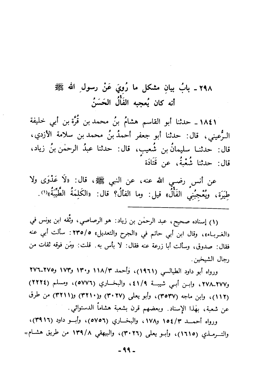 1841 - حَدَّثَنَا أَبُو الْقَاسِمِ هِشَامُ بْنُ مُحَمَّدِ بْنِ قُرَّةَ بْنِ أَبِي خَلِيفَةَ الرُّعَيْنِيُّ قَالَ: حَدَّثَنَا أَبُو جَعْفَرٍ أَحْمَدُ بْنُ مُحَمَّدِ بْنِ سَلَامَةَ الْأَزْدِيُّ قَالَ: حَدَّثَنَا سُلَيْمَانُ بْنُ شُعَيْبٍ قَالَ: حَدَّثَنَا عَبْدُ الرَّحْمَنِ بْنُ زِيَادٍ قَالَ: حَدَّثَنَا شُعْبَةُ , عَنْ قَتَادَةَ , عَنْ أَنَسٍ رَضِيَ اللهُ عَنْهُ , عَنِ النَّبِيِّ صَلَّى اللَّهُ عَلَيْهِ وَسَلَّمَ قَالَ: " لَا عَدْوَى وَلَا طِيَرَةَ وَيُعْجِبُنِي الْفَأْلُ " قِيلَ: وَمَا الْفَأْلُ؟ قَالَ: " الْكَلِمَةُ الطَّيِّبَةُ "