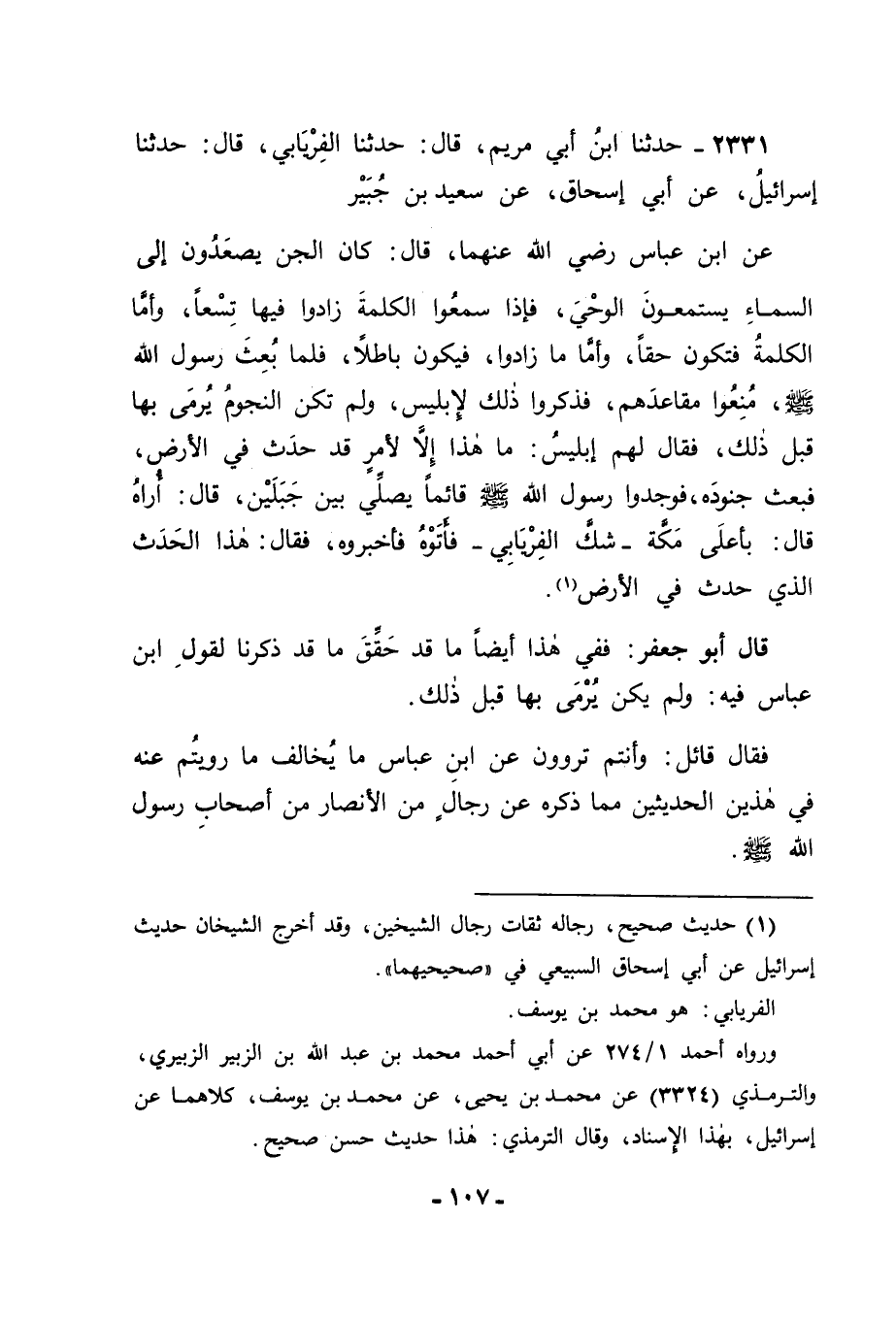 2331 - حَدَّثَنَا ابْنُ أَبِي مَرْيَمَ، قَالَ: حَدَّثَنَا الْفِرْيَابِيُّ، قَالَ: حَدَّثَنَا إسْرَائِيلُ، عَنْ أَبِي إِسْحَاقَ، عَنْ سَعِيدِ بْنِ جُبَيْرٍ، عَنِ ابْنِ عَبَّاسٍ رَضِيَ اللهُ عَنْهُمَا قَالَ: " كَانَ الْجِنُّ يَصْعَدُونَ إِلَى السَّمَاءِ يَسْتَمِعُونَ الْوَحْيَ، فَإِذَا سَمِعُوا الْكَلِمَةَ زَادُوا فِيهَا تِسْعًا , وَأَمَّا الْكَلِمَةُ فَتَكُونُ حَقًّا، وَأَمَّا مَا زَادُوا فَيَكُونُ بَاطِلًا، فَلَمَّا بُعِثَ رَسُولُ اللهِ صَلَّى اللَّهُ عَلَيْهِ وَسَلَّمَ مُنِعُوا مَقَاعِدَهُمْ، فَذَكَرُوا ذَلِكَ لِإِبْلِيسَ وَلَمْ تَكُنِ النُّجُومُ يُرْمَى بِهَا قَبْلَ ذَلِكَ , فَقَالَ لَهُمْ إبْلِيسُ: مَا هَذَا إِلَّا لِأَمْرٍ قَدْ حَدَثَ فِي الْأَرْضِ، فَبَعَثَ جُنُودَهُ فَوَجَدُوا رَسُولَ اللهِ صَلَّى اللَّهُ عَلَيْهِ وَسَلَّمَ قَائِمًا يُصَلِّي بَيْنَ جَبَلَيْنِ قَالَ: أُرَاهُ قَالَ: بِأَعْلَى مَكَّةَ شَكَّ الْفِرْيَابِيُّ فَأَتَوْهُ فَأَخْبَرُوهُ، فَقَالَ: هَذَا الْحَدَثُ الَّذِي حَدَثَ فِي الْأَرْضِ " قَالَ أَبُو جَعْفَرٍ: فَفِي هَذَا أَيْضًا مَا قَدْ حَقَّقَ مَا قَدْ ذَكَرْنَا لِقَوْلِ ابْنِ عَبَّاسٍ فِيهِ: وَلَمْ يَكُنْ يُرْمَى بِهَا قَبْلَ ذَلِكَ فَقَالَ قَائِلٌ: وَأَنْتُمْ تَرْوُونَ عَنِ ابْنِ عَبَّاسٍ مَا يُخَالِفُ مَا رَوَيْتُمْ عَنْهُ فِي هَذَيْنِ الْحَدِيثَيْنِ مِمَّا ذَكَرَهُ عَنْ رِجَالٍ مِنَ الْأَنْصَارِ مِنْ أَصْحَابِ رَسُولِ اللهِ صَلَّى اللَّهُ عَلَيْهِ وَسَلَّمَ