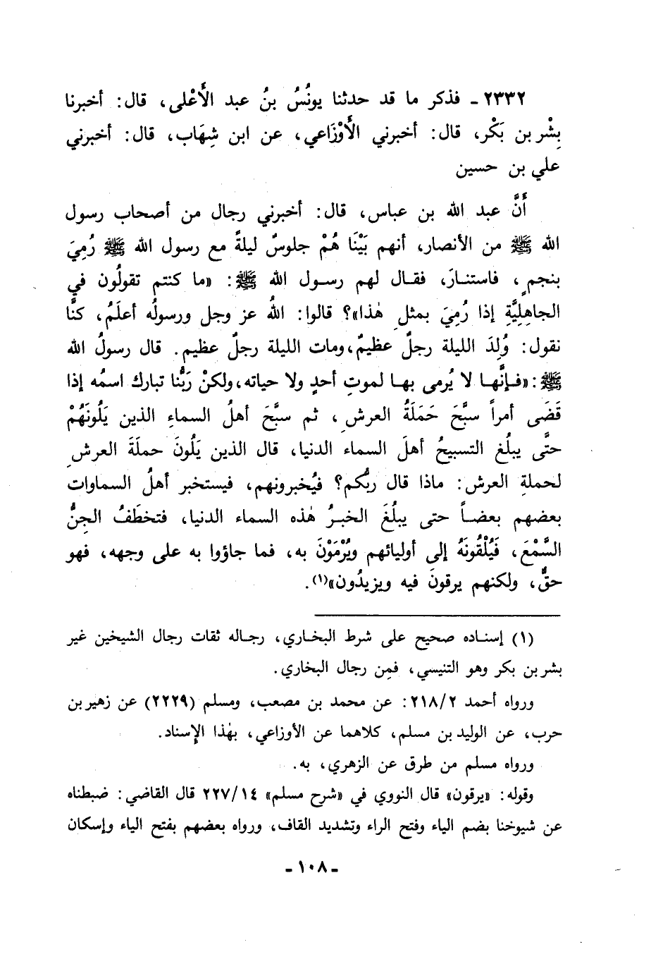 2332 - فَذَكَرَ مَا قَدْ حَدَّثَنَا يُونُسُ بْنُ عَبْدِ الْأَعْلَى، قَالَ: أَخْبَرَنَا بِشْرُ بْنُ بَكْرٍ، قَالَ: أَخْبَرَنِي الْأَوْزَاعِيُّ، عَنِ ابْنِ شِهَابٍ، قَالَ: أَخْبَرَنِي عَلِيُّ بْنُ حُسَيْنٍ أَنَّ عَبْدَ اللهِ بْنَ عَبَّاسٍ قَالَ: أَخْبَرَنِي رِجَالٌ مِنْ أَصْحَابِ رَسُولِ اللهِ صَلَّى اللَّهُ عَلَيْهِ وَسَلَّمَ مِنَ الْأَنْصَارِ أَنَّهُمْ بَيْنَا هُمْ جُلُوسٌ لَيْلَةً مَعَ رَسُولِ اللهِ صَلَّى اللَّهُ عَلَيْهِ وَسَلَّمَ رُمِيَ بِنَجْمٍ فَاسْتَنَارَ , فَقَالَ لَهُمْ رَسُولُ اللهِ صَلَّى اللَّهُ عَلَيْهِ وَسَلَّمَ: " مَا كُنْتُمْ تَقُولُونَ فِي الْجَاهِلِيَّةِ إِذَا رُمِيَ بِمِثْلِ هَذَا؟ " قَالُوا: اللهُ عَزَّ وَجَلَّ وَرَسُولُهُ أَعْلَمُ، كُنَّا نَقُولُ: وُلِدَ اللَّيْلَةَ رَجُلٌ عَظِيمٌ , وَمَاتَ اللَّيْلَةَ رَجُلٌ عَظِيمٌ. قَالَ رَسُولُ اللهِ صَلَّى اللَّهُ عَلَيْهِ وَسَلَّمَ: " فَإِنَّهَا لَا يُرْمَى بِهَا لِمَوْتِ أَحَدٍ وَلَا حَيَاتِهِ، وَلَكِنَّ رَبَّنَا تَبَارَكَ اسْمُهُ إِذَا قَضَى أَمْرًا سَبَّحَ حَمَلَةُ الْعَرْشِ، ثُمَّ سَبَّحَ أَهْلُ السَّمَاءِ الَّذِينَ يَلُونَهُمْ حَتَّى يَبْلُغَ التَّسْبِيحُ أَهْلَ السَّمَاءِ الدُّنْيَا، قَالَ الَّذِينَ يَلُونَ حَمَلَةَ الْعَرْشِ لِحَمَلَةِ الْعَرْشِ: مَاذَا قَالَ رَبُّكُمْ؟ فَيُخْبِرُونَهُمْ، فَيَسْتَخْبِرُ أَهْلُ السَّمَوَاتِ بَعْضُهُمْ بَعْضًا حَتَّى يَبْلُغَ الْخَبَرُ هَذِهِ السَّمَاءَ الدُّنْيَا، فَتَخْطَفُ الْجِنُّ السَّمْعَ، فَيُلْقُونَهُ إِلَى أَوْلِيَائِهِمْ وَيُرْمَوْنَ بِهِ، فَمَا جَاءُوا بِهِ عَلَى وَجْههٍ فَهُوَ حَقٌّ، وَلَكِنَّهُمْ يَرْقَوْنَ فِيهِ وَيَزِيدُونَ ". -[109]-